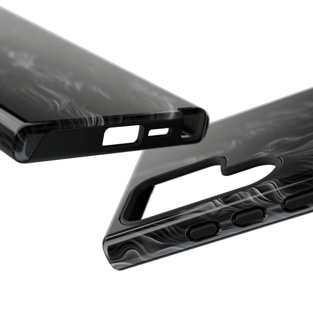 Dit hoesje heeft een abstract patroon van golvende, vloeiende lijnen in verschillende tinten zwart en grijs. De lijnen zorgen voor een gelaagd en textuurrijk effect met soepele kleurverlopen en een gevoel van diepte. De uitstraling is dynamisch en organisch, waarbij donkere tinten overheersen. Het patroon is gedrukt op een glanzend, stevig hoesje met een buitenkant van polycarbonaat en een binnenzijde van TPU. Deze dubbele laag biedt extra bescherming en ondersteunt draadloos opladen. Het hoesje is ontworpen voor duurzaamheid en bestand tegen gebruik buitenshuis.