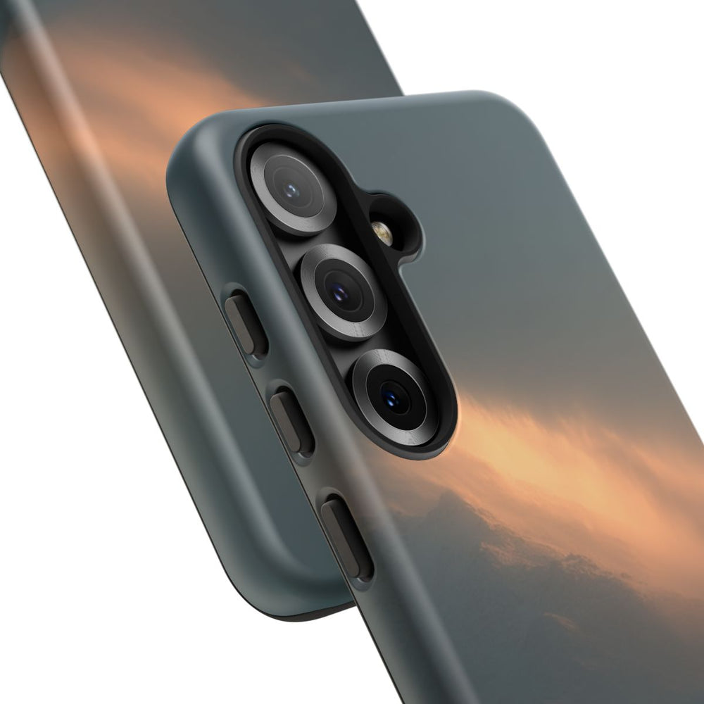 Dit hoesje toont een persoon die alleen over een pad loopt in een uitgestrekt, open landschap. Op de achtergrond zie je een bergketen met besneeuwde toppen. Een warm licht valt op een deel van de berg, wat zorgt voor een opvallend contrast met de koele, rustige kleuren eromheen. De afbeelding straalt een serene en contemplatieve sfeer uit. Het stevige, matte hoesje heeft twee lagen: een buitenkant van polycarbonaat en een binnenzijde van TPU, voor extra bescherming en ondersteuning van draadloos opladen.