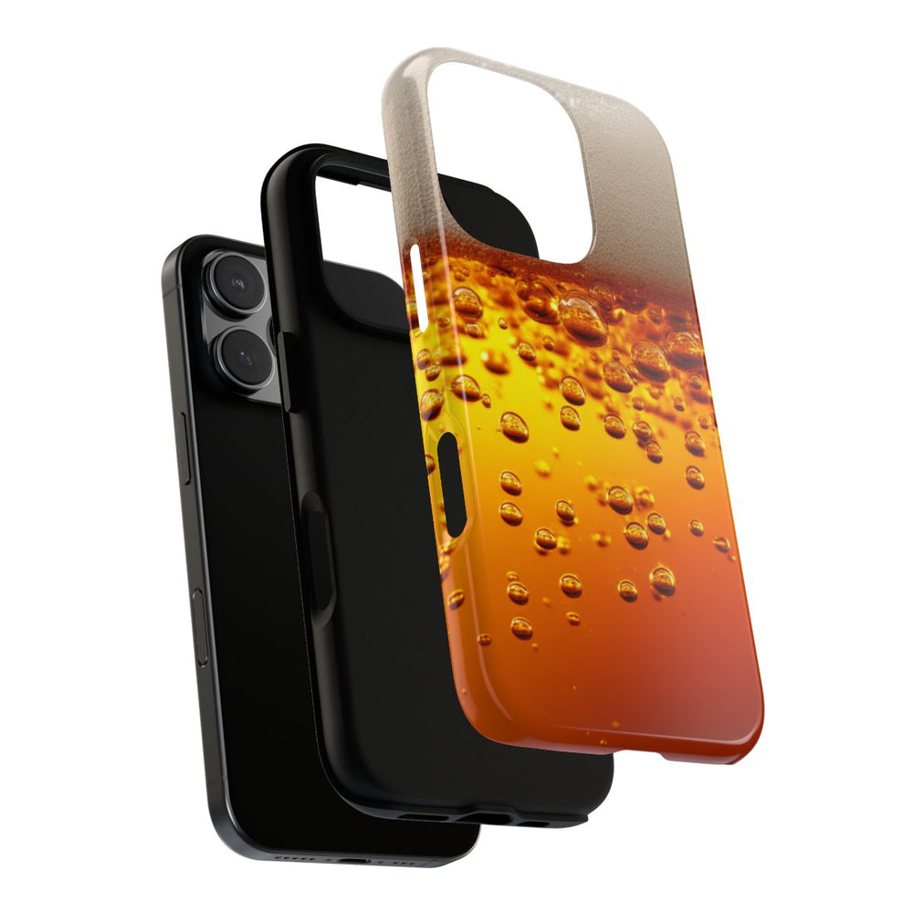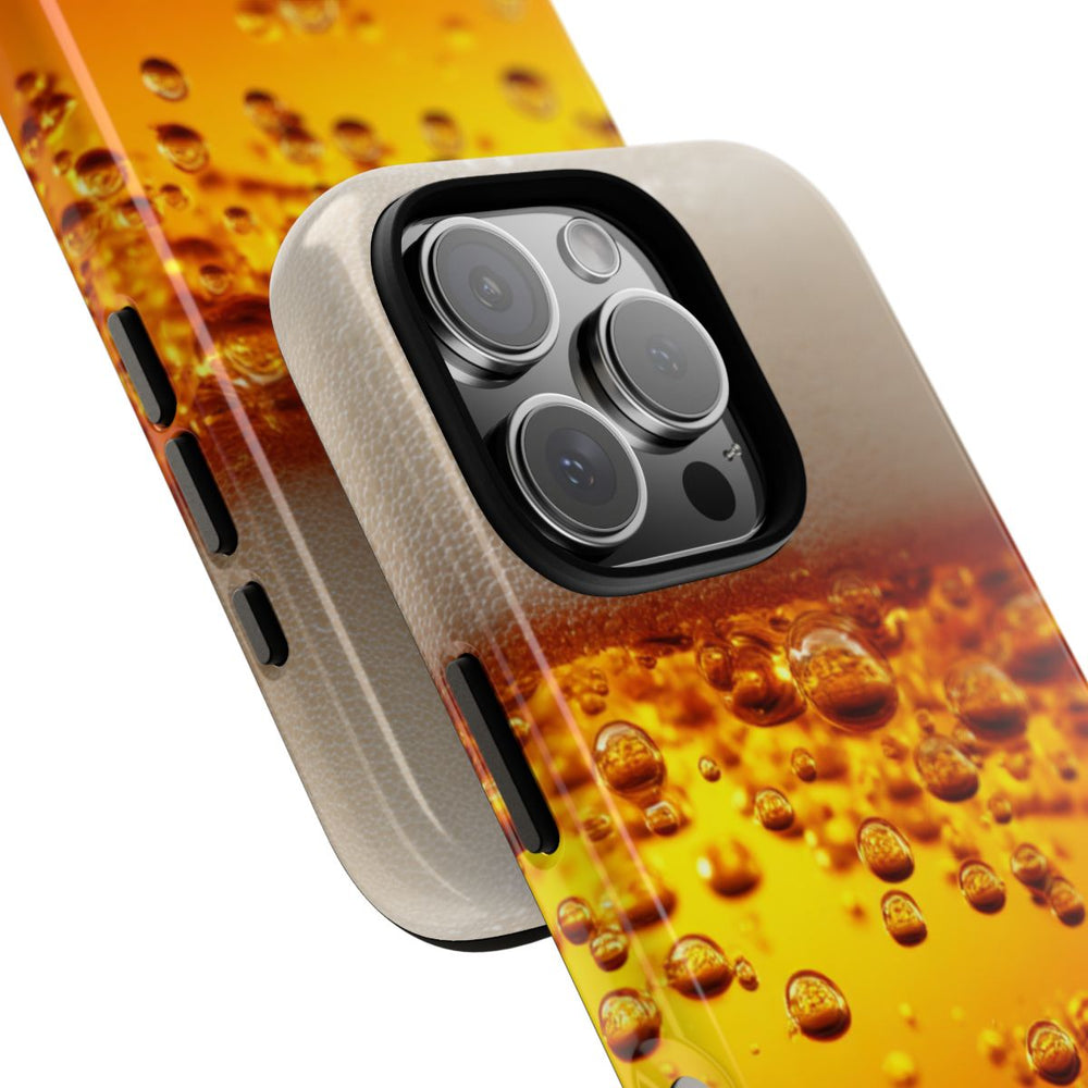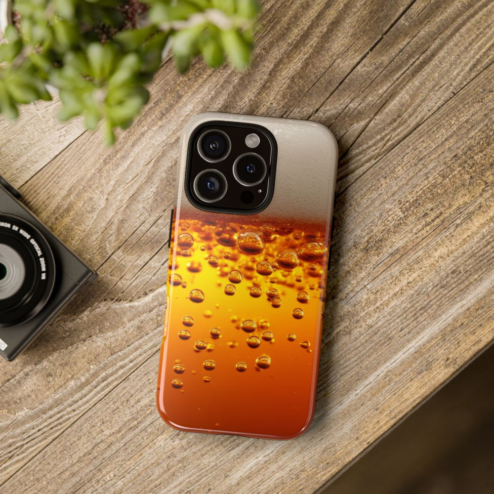Dit telefoonhoesje toont een gedetailleerde close-up van amberkleurig bier met talloze kleine belletjes die omhoog stijgen. Bovenaan is een dikke laag witte schuimkraag met fijne belletjes zichtbaar, wat zorgt voor een realistische uitstraling. De levendige goudtinten en de details van de bubbels komen prachtig naar voren in het naadloze, beeldvullende ontwerp. Het hoesje heeft een glanzende afwerking, is gemaakt van polycarbonaat en TPU en biedt stevige dubbele bescherming. Geschikt voor draadloos opladen. Het ontwerp is fotorealistisch en zeer gedetailleerd.