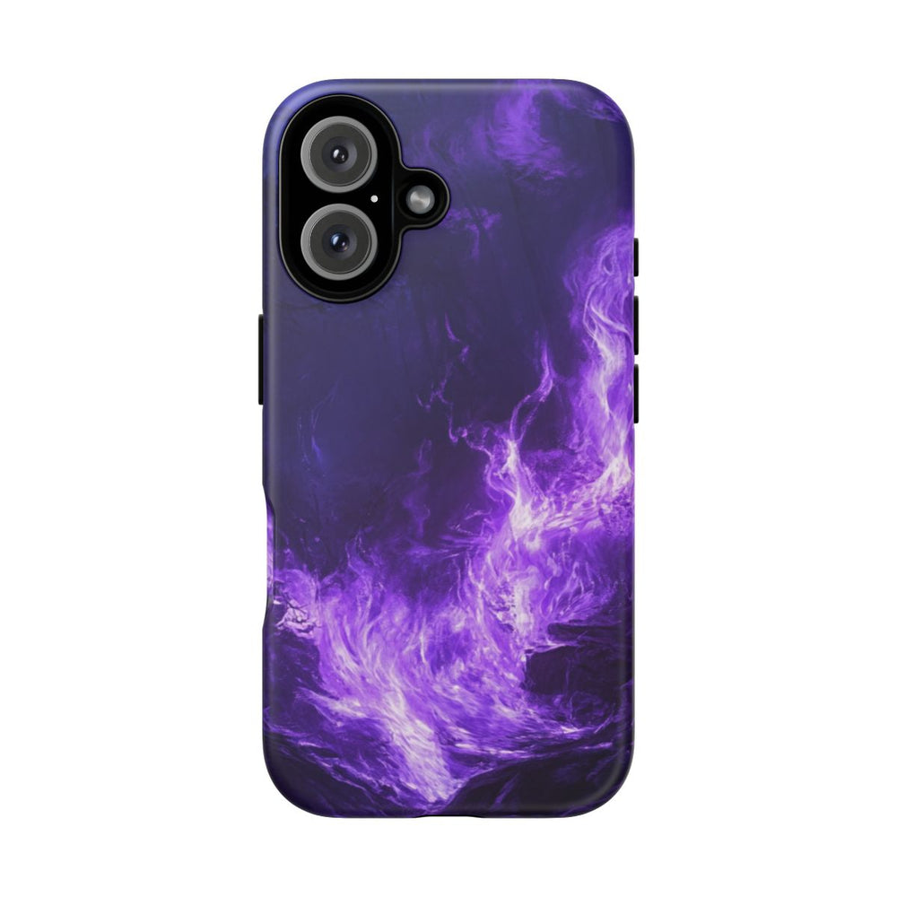 Dit hoesje heeft een opvallend ontwerp met heldere paarse vlammen die dansen en oplichten in een donker, schaduwrijk bos. De vlammen geven een mysterieuze en bovennatuurlijke sfeer en verlichten de bomen en de rotsachtige bodem met een magisch licht. Het hoesje bestaat uit twee lagen van polycarbonaat en TPU voor extra stevigheid en bescherming. Geschikt voor draadloos opladen, maar niet voor MagSafe.