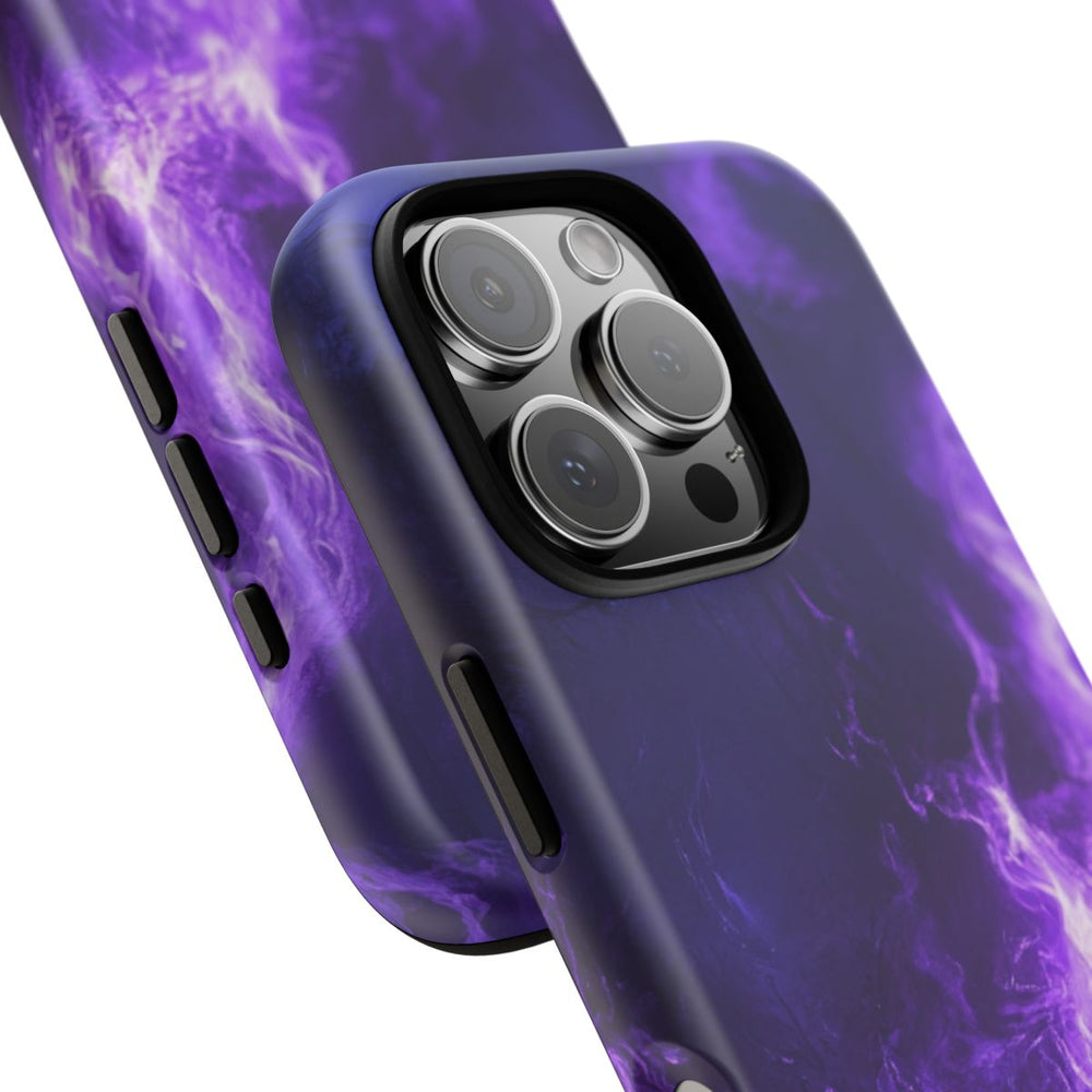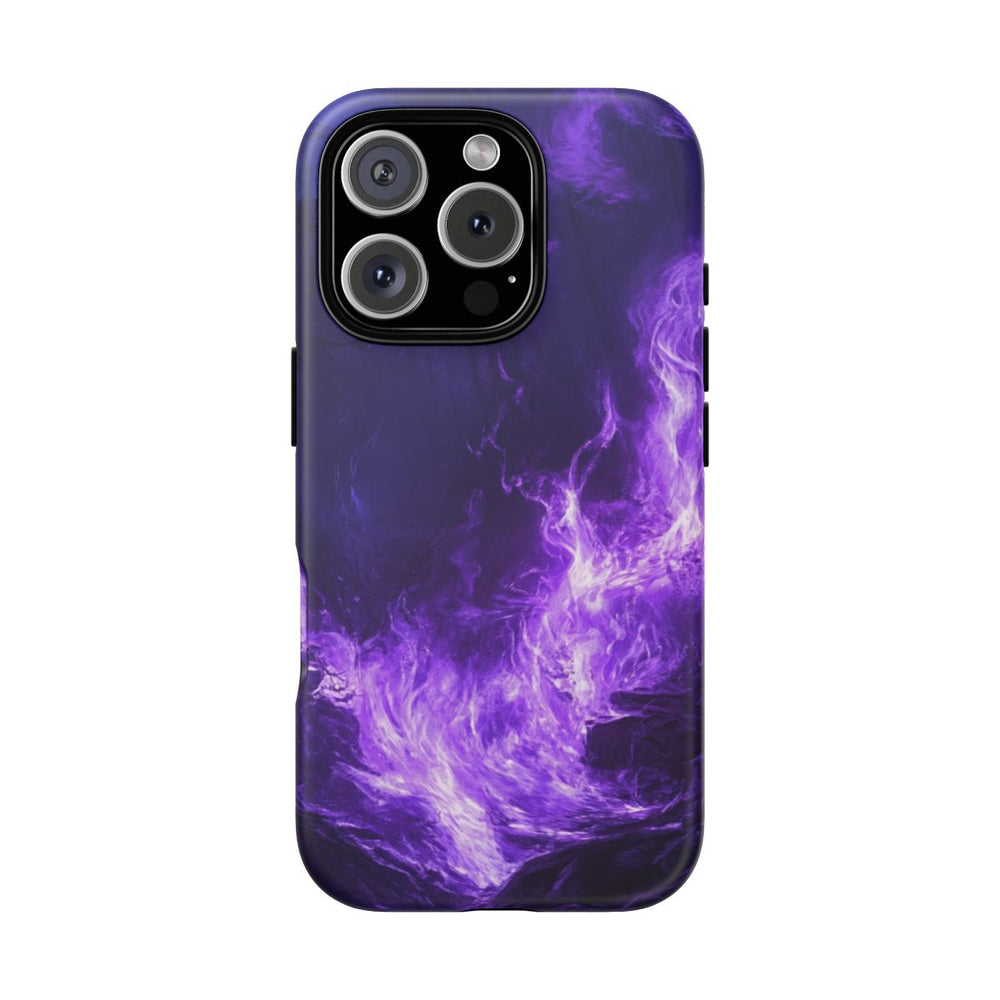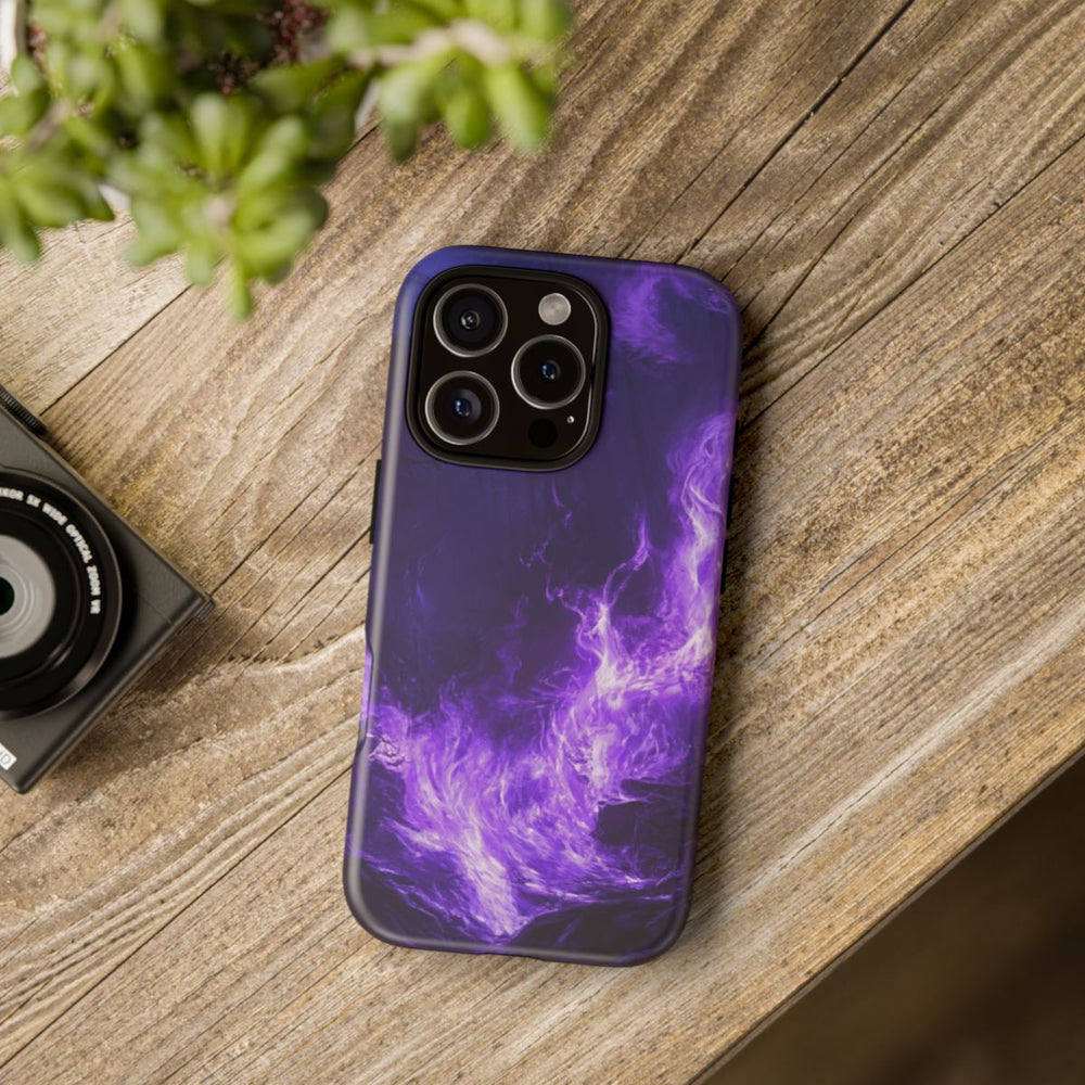 Dit hoesje heeft een ontwerp met levendige paarse vlammen die omhoog rijzen en kronkelen in een donker, schaduwrijk bos. Op de achtergrond zijn hoge, vage bomen en een rotsachtige ondergrond te zien, wat zorgt voor een mysterieuze en griezelige sfeer. Het hoesje bestaat uit twee lagen met een matte afwerking en is gemaakt van polycarbonaat en TPU voor extra stevigheid en bescherming. Ondersteunt draadloos opladen, maar is niet geschikt voor MagSafe.