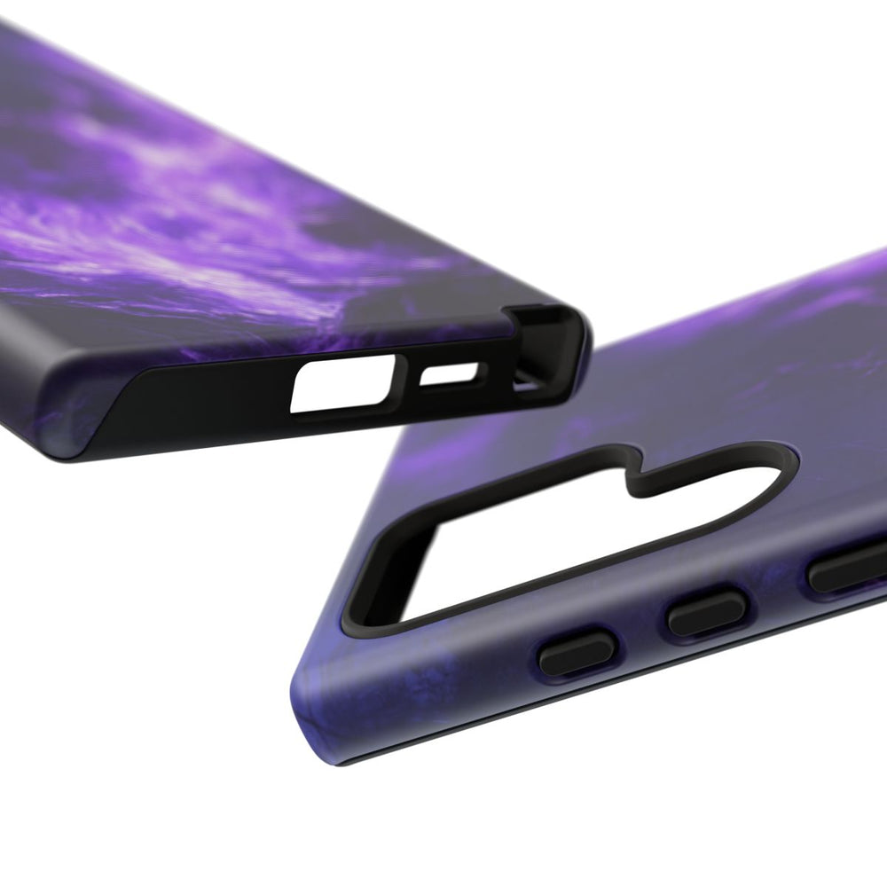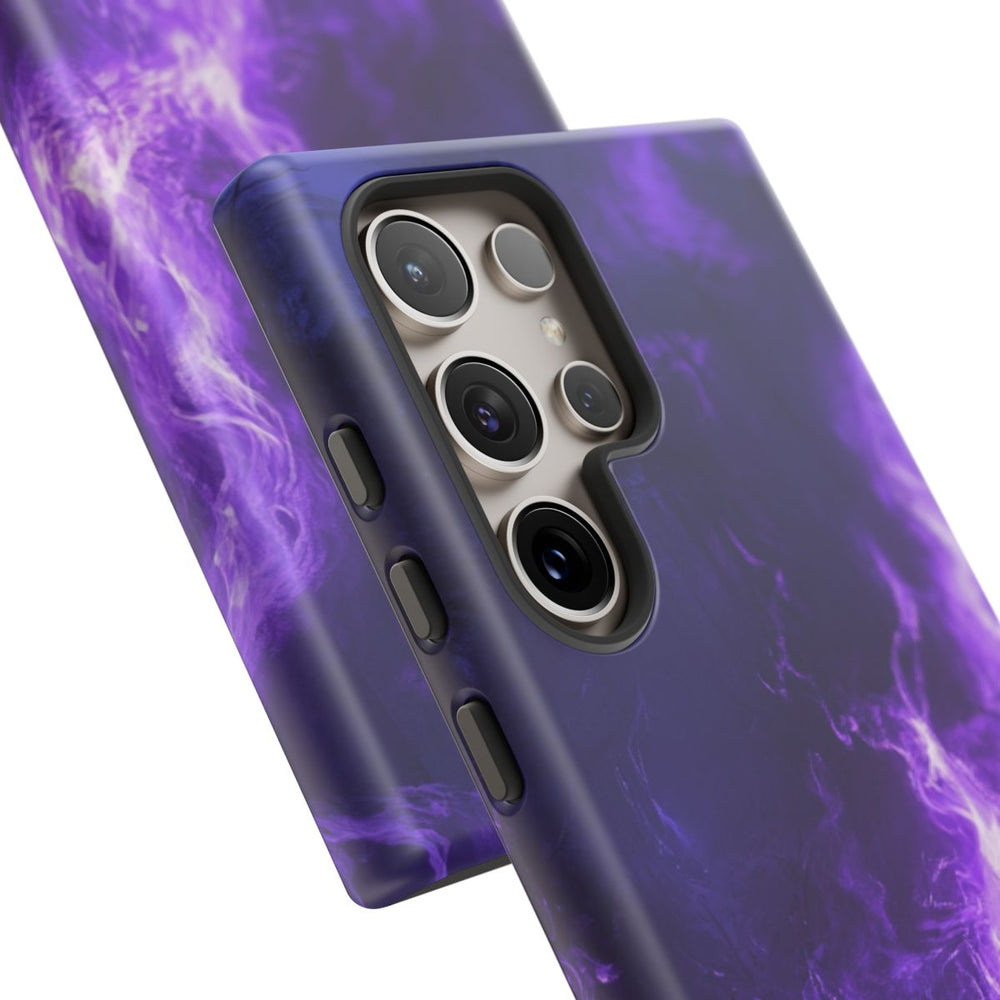 Dit ontwerp toont een duister bos waarin felpaarse vlammen omhoog kronkelen en het landschap verlichten. De vlammen zorgen voor een spookachtige en mysterieuze sfeer tussen de schaduwrijke bomen en het ruige terrein. Het hoesje is een stevige, matte uitvoering met een dubbele laag van polycarbonaat en TPU voor extra bescherming en duurzaamheid. Geschikt voor draadloos opladen en bestand tegen invloeden van buitenaf.