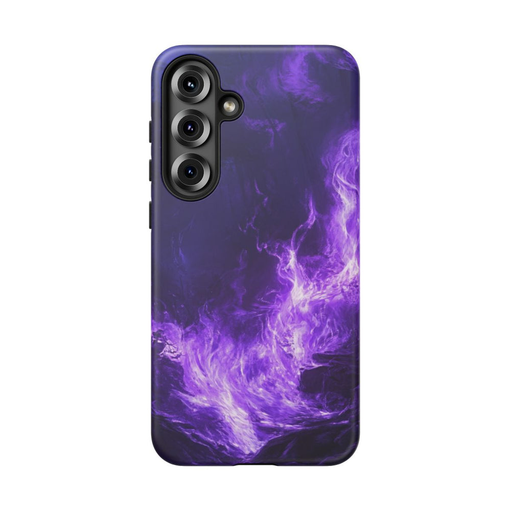 Dit hoesje toont een duister bos, sfeervol verlicht door felpaarse vlammen die omhoog kronkelen en draaien. De vlammen zorgen voor een mysterieuze, bijna bovennatuurlijke uitstraling tussen de donkere bomen en rotsachtige ondergrond. Het hoesje heeft een dubbele laag met een stevige polycarbonaat buitenkant en een TPU binnenzijde voor extra bescherming. Geschikt voor draadloos opladen en ontworpen voor langdurige helderheid en duurzaamheid, ook bij buitengebruik.