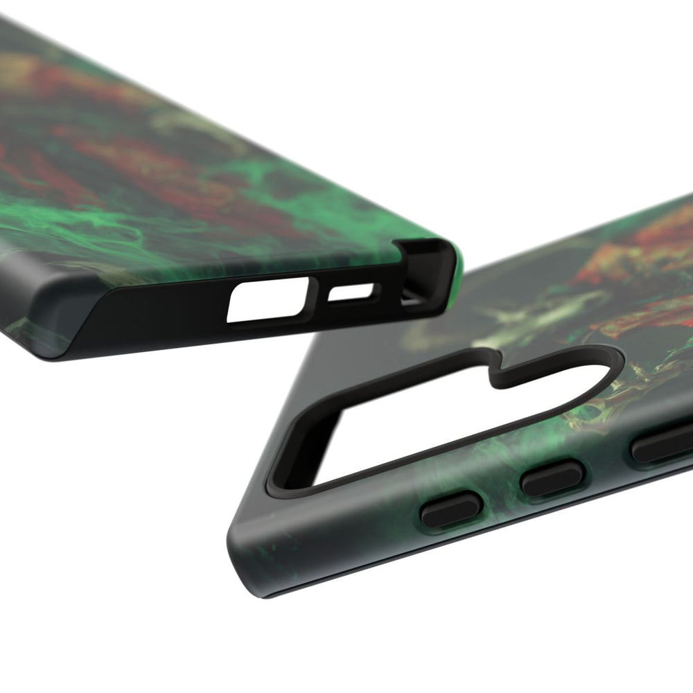 Dit hoesje toont een mysterieus wezen met een geitenschedel en grote, gebogen hoorns. Het figuur draagt een golvende, scharlakenrode mantel met verfijnde patronen. Rondom het wezen dansen groene, magische vlammen die een nachtelijke sfeer oproepen. De illustratie is zeer gedetailleerd en laat duidelijk de benige handen van het figuur zien. Het hoesje bestaat uit twee lagen voor extra stevigheid en bescherming, en ondersteunt draadloos opladen.