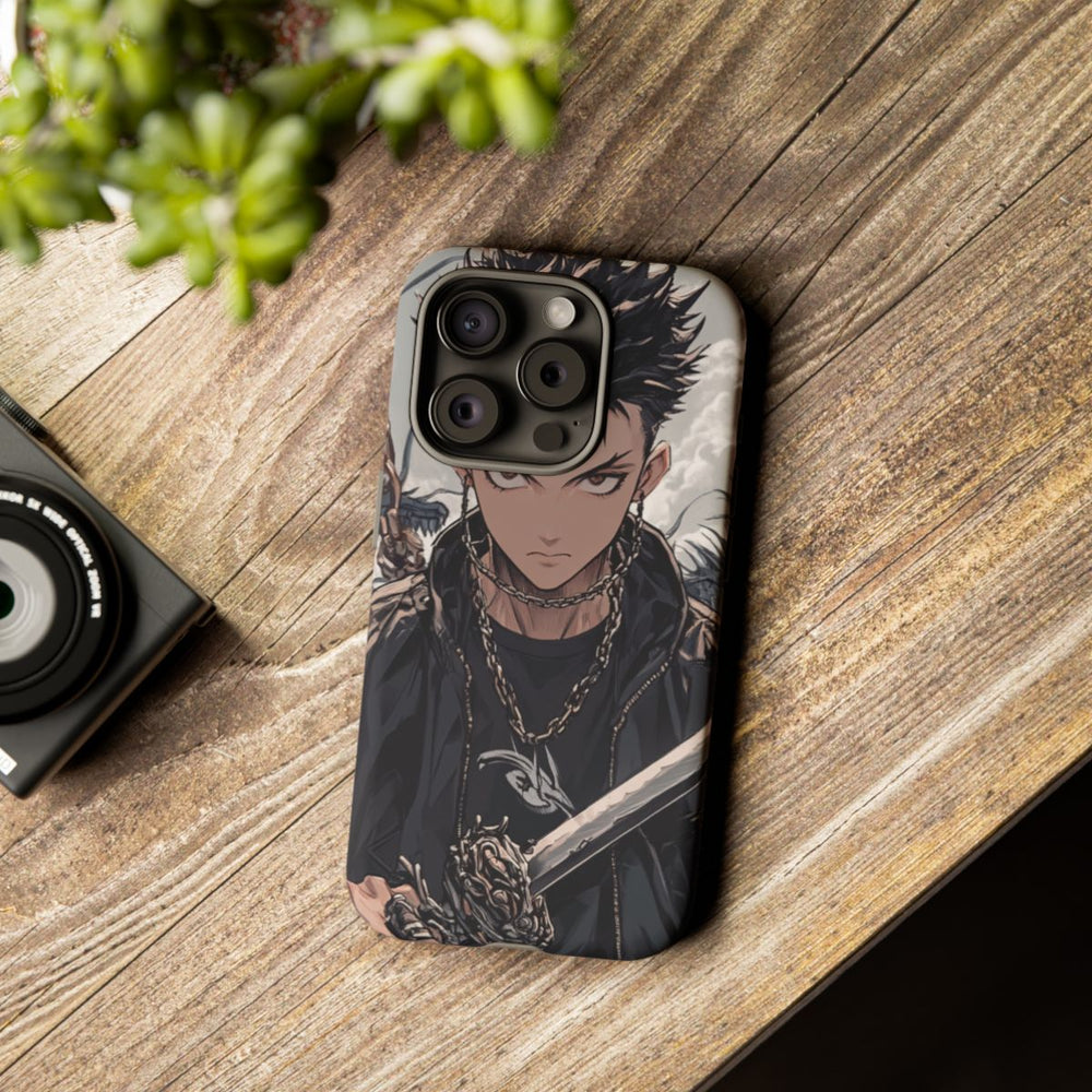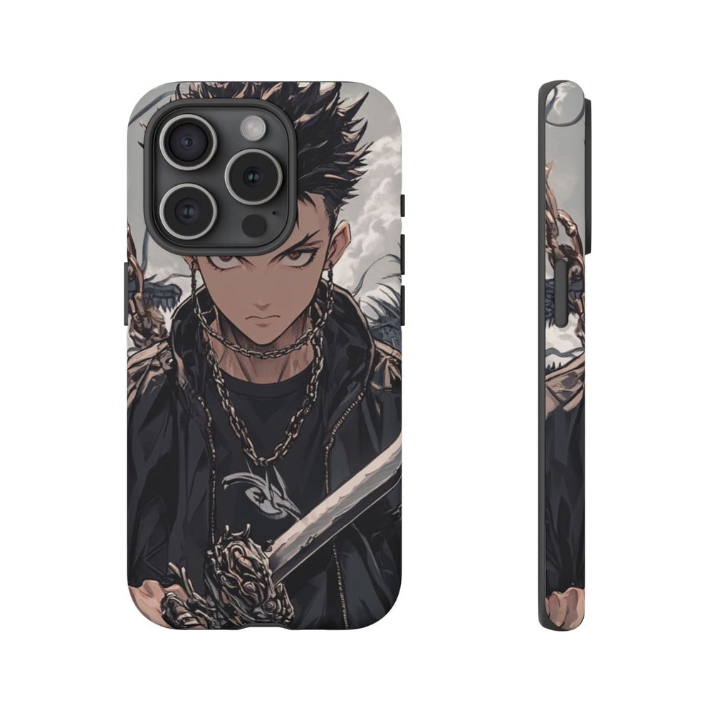 Dit hoesje toont een jonge strijder in anime-stijl met stekelig zwart haar, die een zwaard vasthoudt dat omwikkeld is met kettingen. De figuur draagt een donker jack en kettingaccessoires. Op de achtergrond kronkelt een gedetailleerde draak tegen een bewolkte lucht. Het ontwerp is uitgewerkt in een gedetailleerde, gestileerde anime-look. Het hoesje bestaat uit twee lagen van polycarbonaat en TPU, heeft een matte afwerking en ondersteunt draadloos opladen.