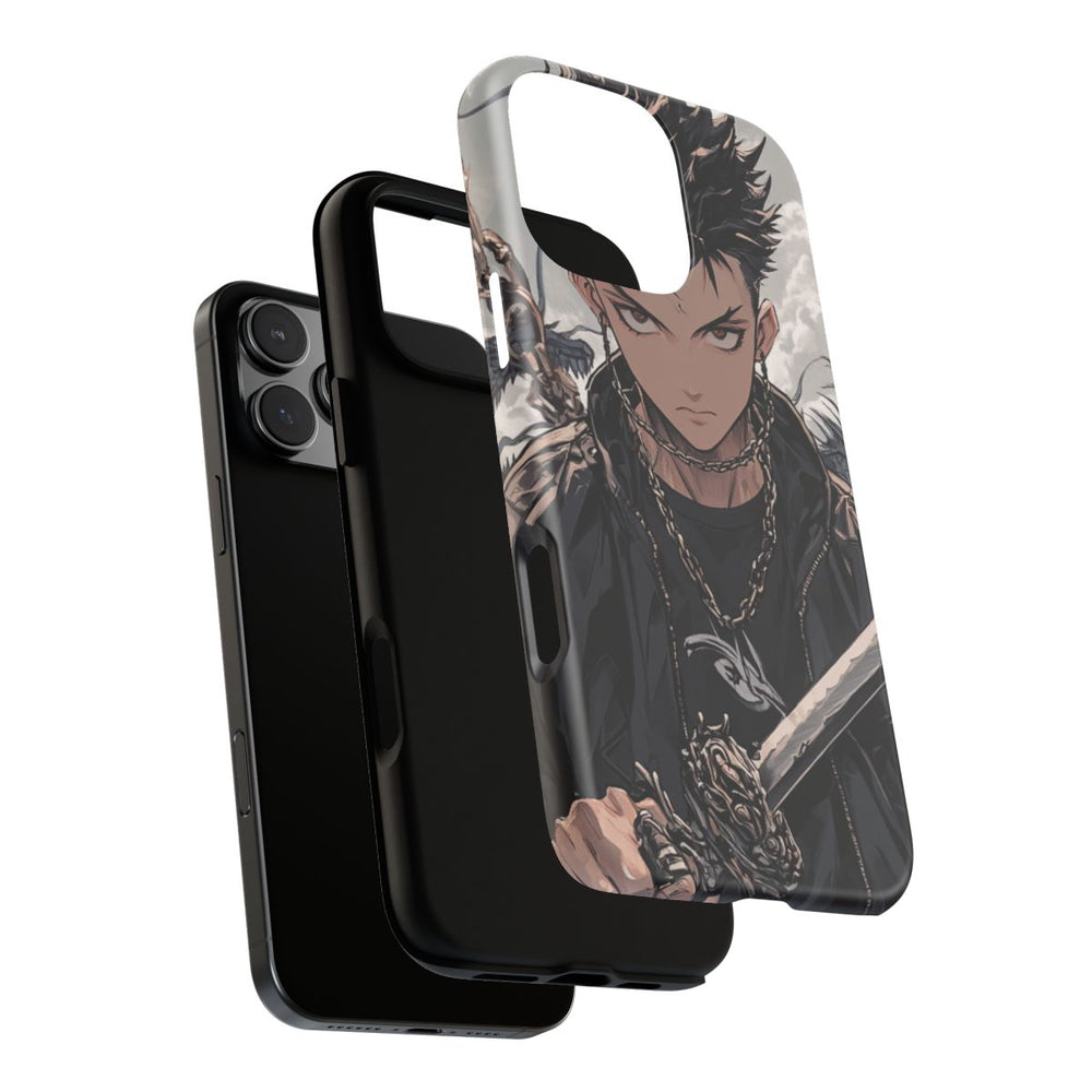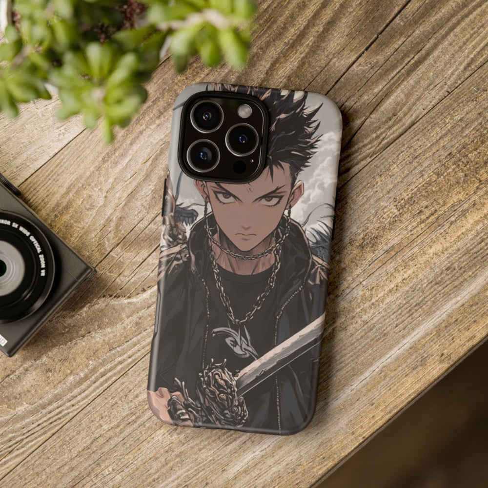 Dit ontwerp toont een jonge anime strijder met stekelig zwart haar, gekleed in een zwarte jas en gewapend met een zwaard met een sierlijk, draakvormig handvat. Kettingen lopen vanuit het zwaard en wikkelen zich om het personage heen. Op de achtergrond kronkelt een gedetailleerde draak tegen een bewolkte hemel. Het hoesje is voorzien van een dubbele laag met een stevige polycarbonaat buitenkant en een TPU binnenvoering. Ondersteunt draadloos opladen en biedt bescherming tegen verschillende weersomstandigheden.