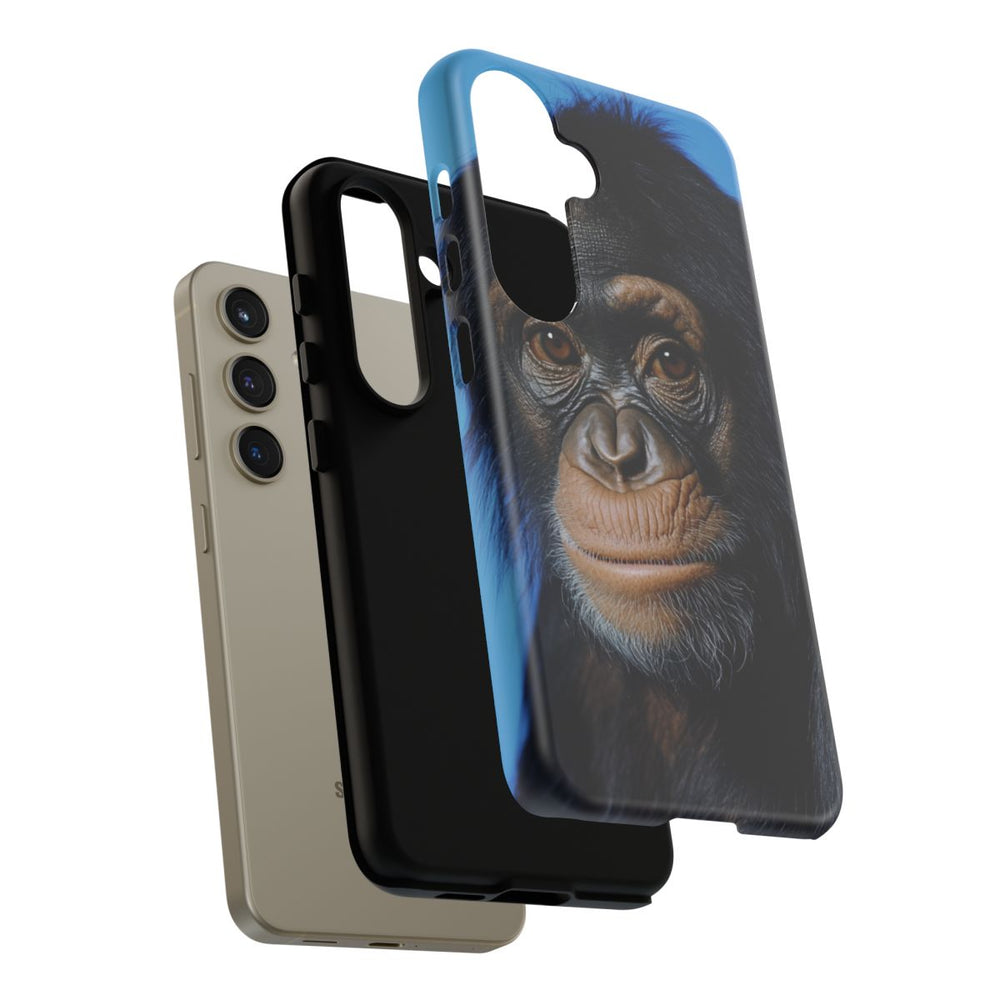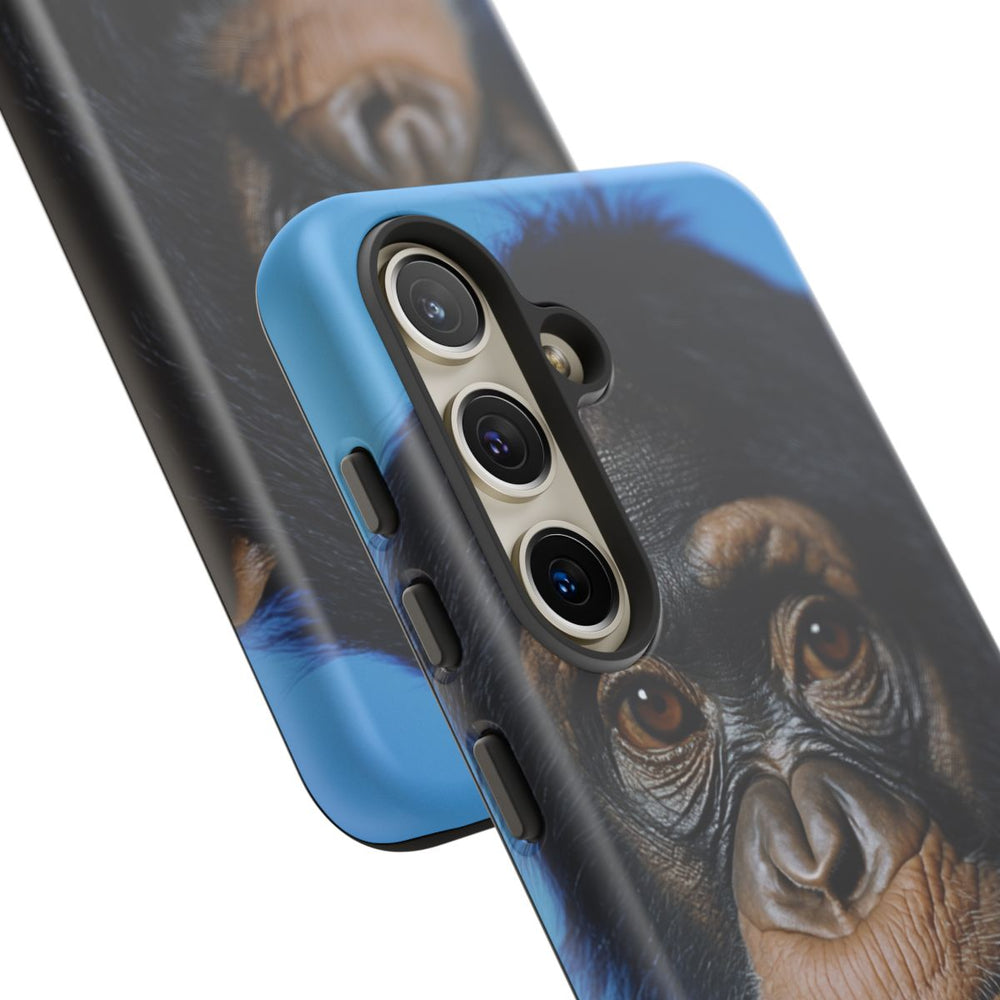 Dit ontwerp toont een close-up portret van een aap met zwarte vacht die recht in de camera kijkt. De achtergrond is helder koningsblauw, wat zorgt voor een opvallend contrast met het dier. Het hoesje heeft een stevige polycarbonaat buitenkant en een TPU-binnenlaag voor extra bescherming. Geschikt voor draadloos opladen en ideaal voor dagelijks gebruik.