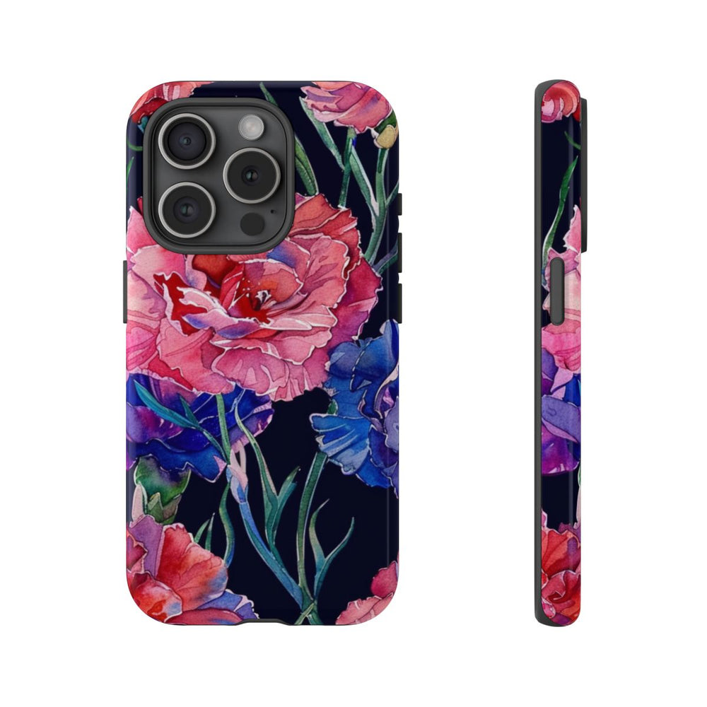 Dit ontwerp heeft een naadloos patroon van meerkleurige anjers in aquarelstijl. De bloemen zijn uitgevoerd in rood, roze, paars en blauw, met fijne groene stelen en bladeren. De donkere achtergrond laat de levendige kleuren van de bloemen extra opvallen. Het patroon is bedrukt op een glanzend, stevig hoesje met een dubbele laag van polycarbonaat en TPU, waardoor het hoesje extra stevig is en optimale bescherming biedt. Dit hoesje ondersteunt draadloos opladen, maar is niet geschikt voor MagSafe.
