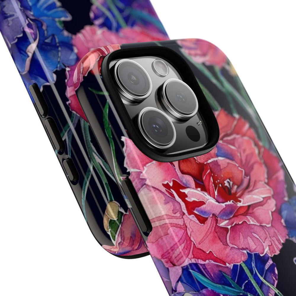 Dit hoesje is voorzien van een naadloos patroon met meerkleurige anjers in aquarelstijl. De bloemen zijn uitgevoerd in tinten rood, roze, paars en blauw, met sierlijke groene stelen en bladeren. De donkere achtergrond laat de levendige kleuren van de bloemen extra opvallen. Het patroon is gedrukt op een glanzend en stevig hoesje met een dubbele laag van polycarbonaat en TPU, wat zorgt voor extra duurzaamheid en bescherming. Het hoesje ondersteunt draadloos opladen, maar is niet geschikt voor MagSafe.