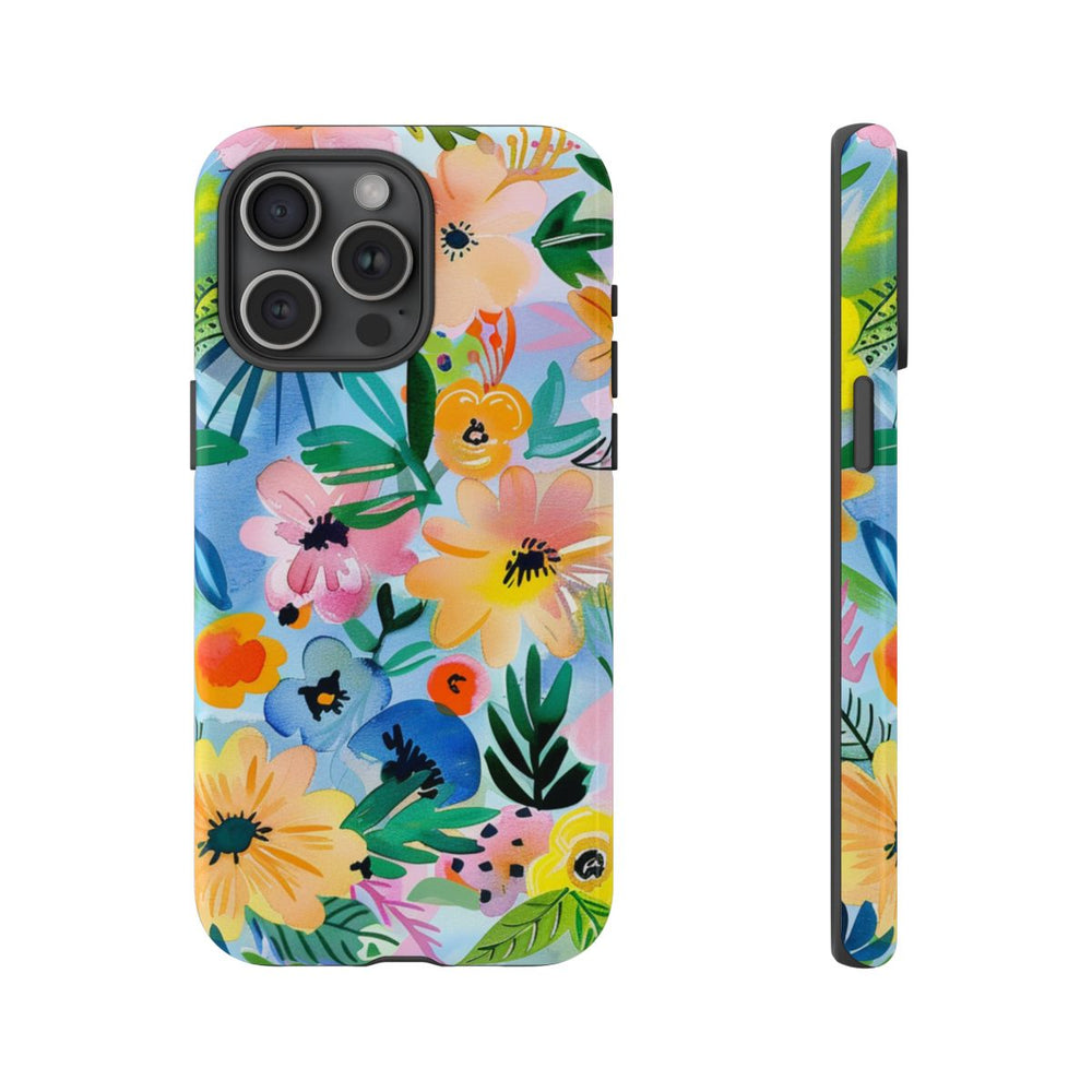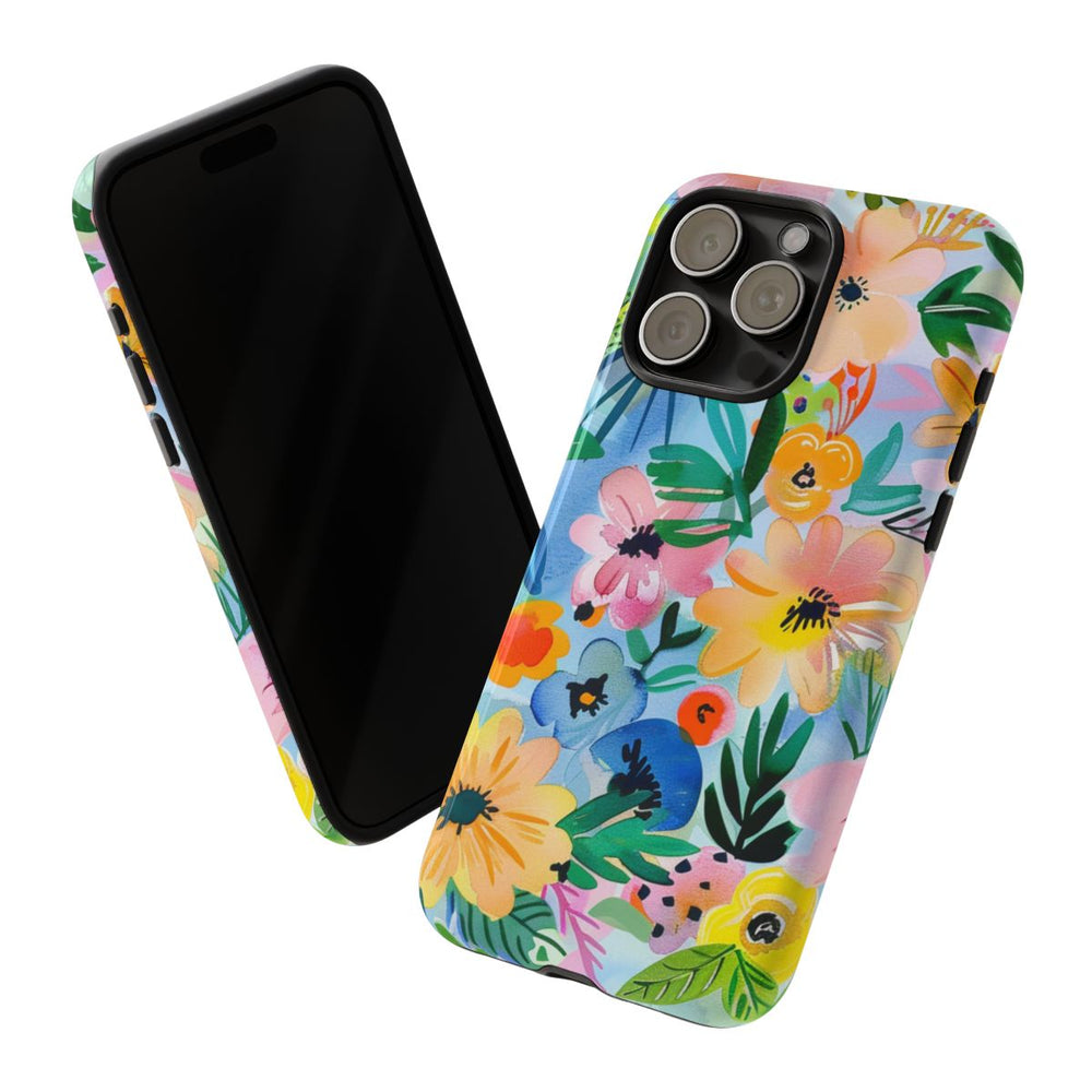 Dit hoesje heeft een levendig bloemenpatroon met een aquarel-effect. Verschillende gestileerde bloemen in tinten roze, oranje, geel en blauw zijn dicht bij elkaar geplaatst, omringd door groene bladeren en takjes. De achtergrond is zacht pastelblauw, waardoor de heldere en vrolijke kleuren van de bloemen extra opvallen. Het patroon oogt speels en levendig en zorgt voor een sierlijke uitstraling. Het hoesje heeft een glanzende afwerking en is gemaakt van polycarbonaat en TPU, wat zorgt voor stevigheid en bescherming. Geschikt voor draadloos opladen.