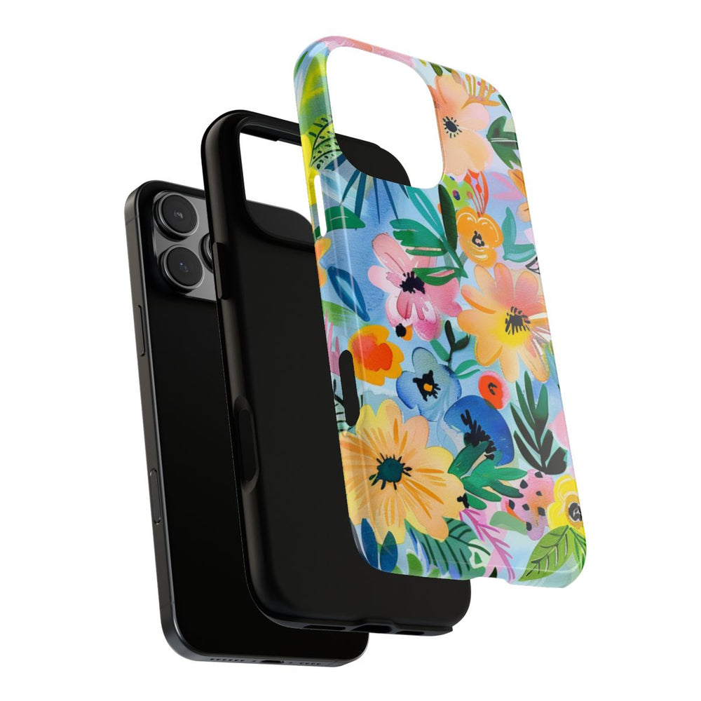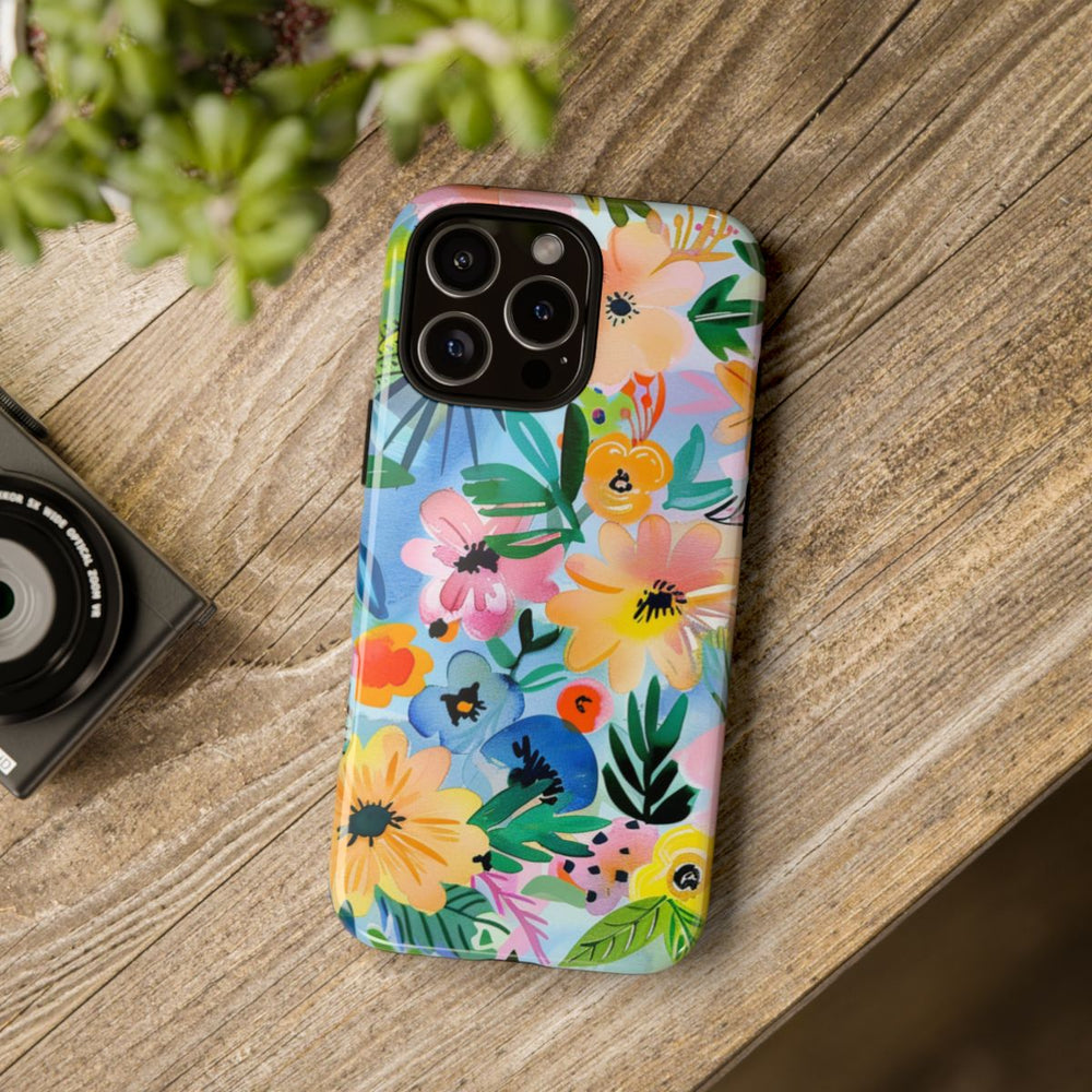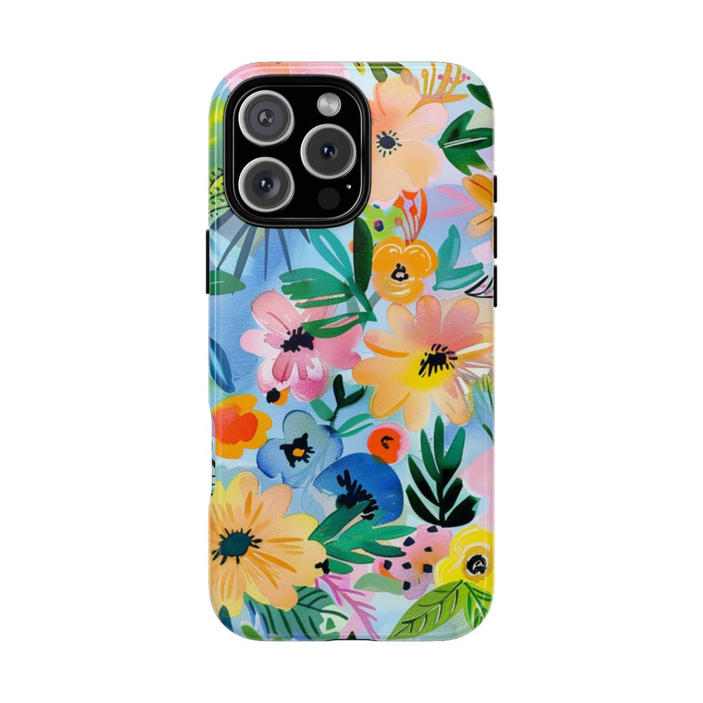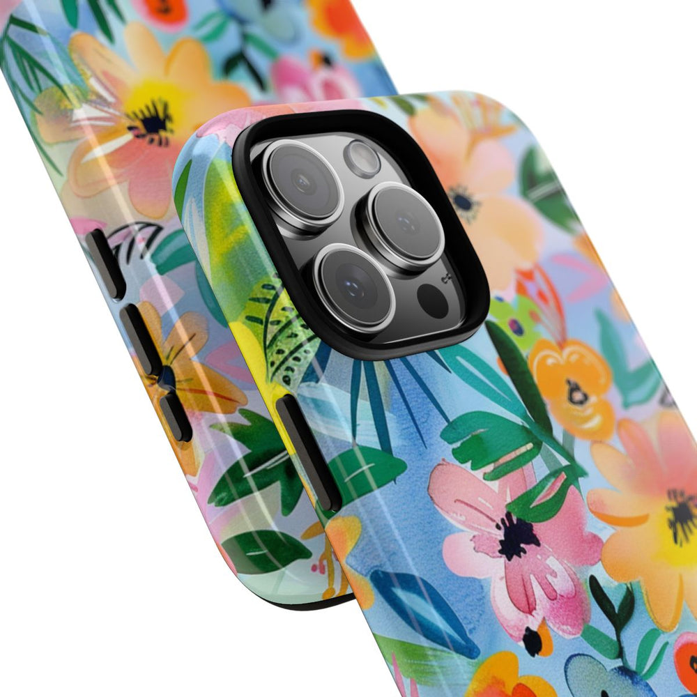 Dit hoesje heeft een levendig bloemenpatroon met een aquarel-effect. Verschillende gestileerde bloemen in tinten roze, oranje, geel en blauw zijn dicht bij elkaar geplaatst, omringd door groene bladeren en takjes. De achtergrond is zacht pastelblauw, waardoor de heldere en vrolijke kleuren van de bloemen extra opvallen. Het patroon oogt speels en levendig en zorgt voor een sierlijke uitstraling. Het hoesje heeft een glanzende afwerking en is gemaakt van polycarbonaat en TPU, wat zorgt voor stevigheid en bescherming. Geschikt voor draadloos opladen.