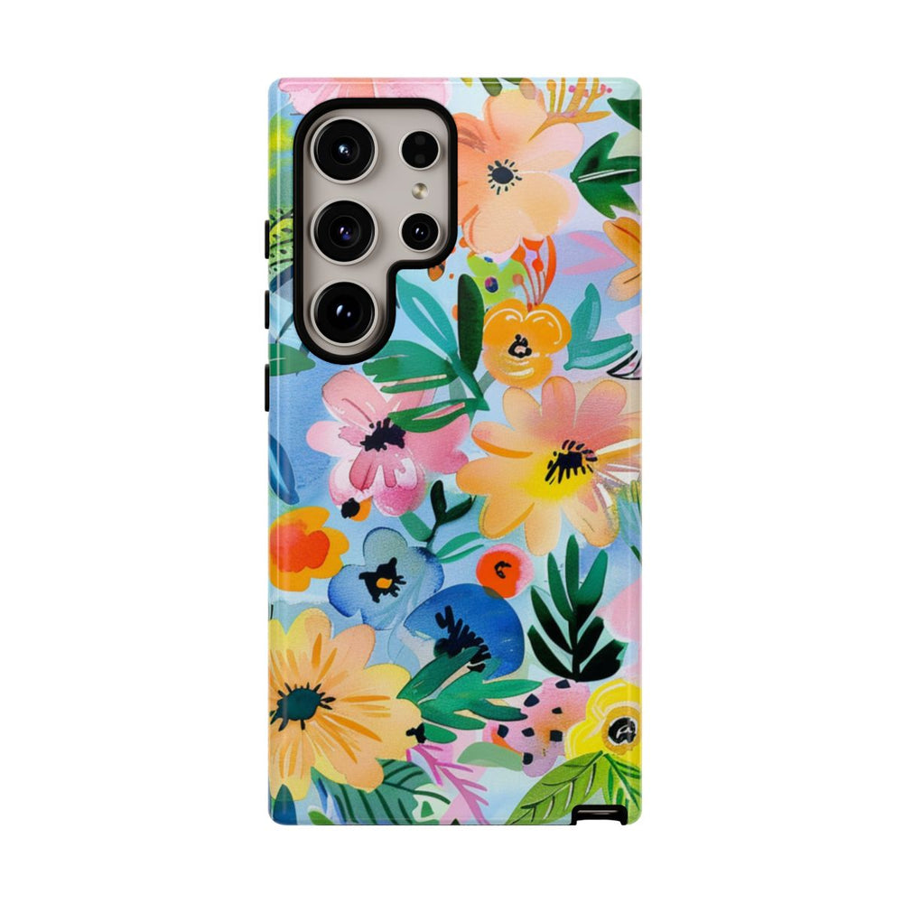 Dit hoesje heeft een levendig bloemenpatroon met een aquarel-effect. Verschillende gestileerde bloemen in tinten roze, oranje, geel en blauw zijn dicht bij elkaar geplaatst, omringd door groene bladeren en takjes. De achtergrond is zacht pastelblauw, waardoor de heldere en vrolijke kleuren van de bloemen extra opvallen. Het patroon oogt speels en levendig en zorgt voor een sierlijke uitstraling. Het hoesje heeft een glanzende afwerking en is gemaakt van polycarbonaat en TPU, wat zorgt voor stevigheid en bescherming. Geschikt voor draadloos opladen.