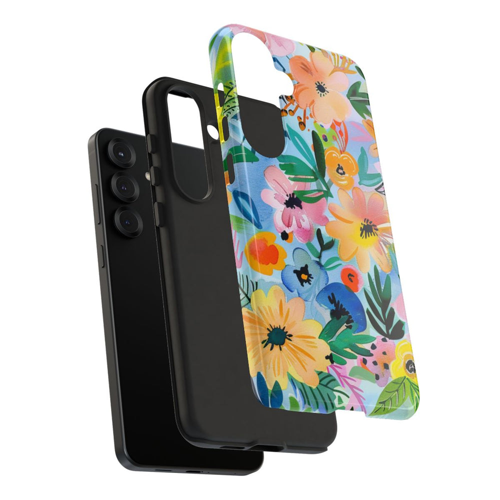 Dit hoesje heeft een levendig bloemenpatroon met een aquarel-effect. Verschillende gestileerde bloemen in tinten roze, oranje, geel en blauw zijn dicht bij elkaar geplaatst, omringd door groene bladeren en takjes. De achtergrond is zacht pastelblauw, waardoor de heldere en vrolijke kleuren van de bloemen extra opvallen. Het patroon oogt speels en levendig en zorgt voor een sierlijke uitstraling. Het hoesje heeft een glanzende afwerking en is gemaakt van polycarbonaat en TPU, wat zorgt voor stevigheid en bescherming. Geschikt voor draadloos opladen.
