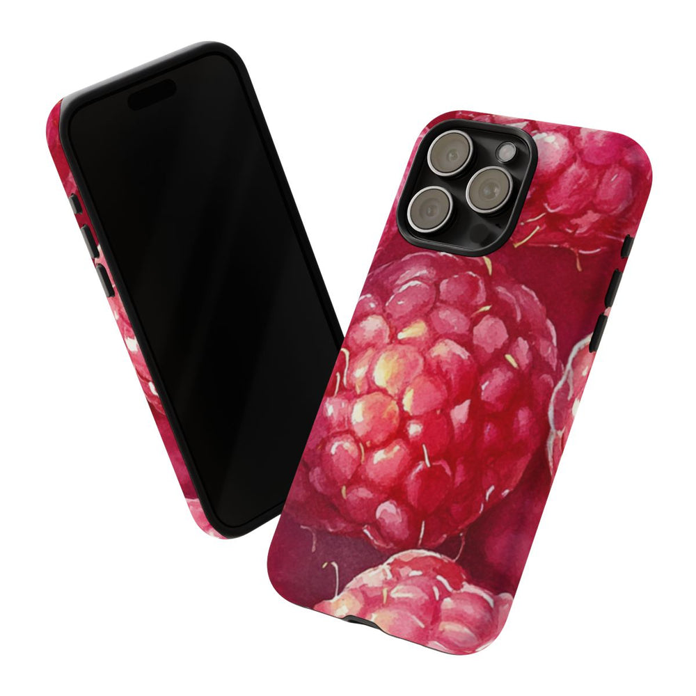 Dit ontwerp toont een close-up van meerdere frambozen, geschilderd in aquarelstijl. De frambozen zijn afgebeeld in verschillende tinten roze en rood, met gedetailleerde texturen en lichte accenten die zorgen voor een realistische en artistieke uitstraling. De achtergrond bestaat uit vergelijkbare kleuren die zacht overlopen in de bessen. Het matte, stevige hoesje is gemaakt van een polycarbonaat buitenkant en een TPU binnenlaag, waardoor het optimale bescherming biedt en geschikt is voor draadloos opladen. Het geheel oogt levendig en natuurlijk, met nadruk op de rijke kleur en structuur van het fruit.