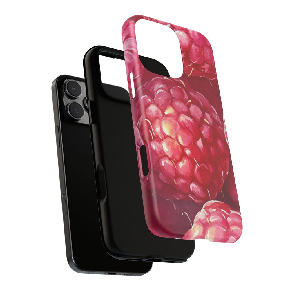 Dit ontwerp toont een close-up van meerdere frambozen, geschilderd in aquarelstijl. De frambozen zijn afgebeeld in verschillende tinten roze en rood, met gedetailleerde texturen en lichte accenten die zorgen voor een realistische en artistieke uitstraling. De achtergrond bestaat uit vergelijkbare kleuren die zacht overlopen in de bessen. Het matte, stevige hoesje is gemaakt van een polycarbonaat buitenkant en een TPU binnenlaag, waardoor het optimale bescherming biedt en geschikt is voor draadloos opladen. Het geheel oogt levendig en natuurlijk, met nadruk op de rijke kleur en structuur van het fruit.