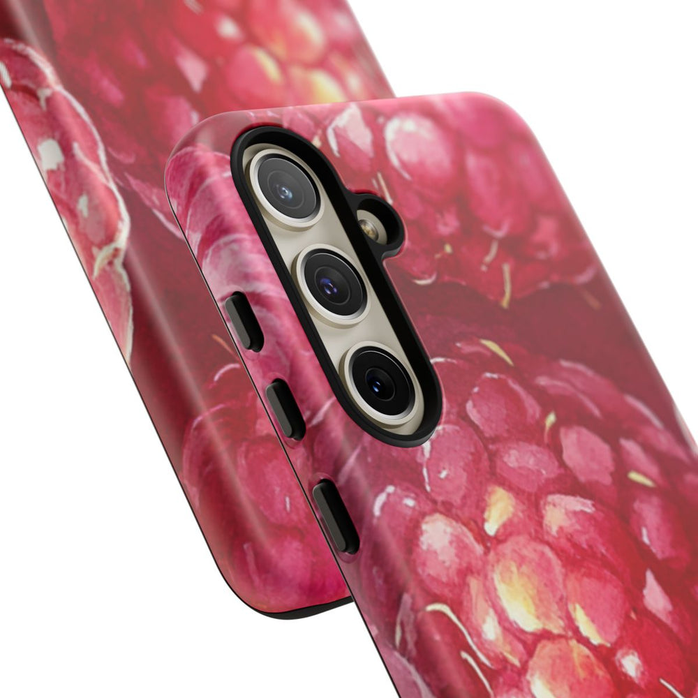 Dit ontwerp toont een close-up van meerdere frambozen, geschilderd in aquarelstijl. De frambozen zijn afgebeeld in verschillende tinten roze en rood, met gedetailleerde texturen en lichte accenten die zorgen voor een realistische en artistieke uitstraling. De achtergrond bestaat uit vergelijkbare kleuren die zacht overlopen in de bessen. Het matte, stevige hoesje is gemaakt van een polycarbonaat buitenkant en een TPU binnenlaag, waardoor het optimale bescherming biedt en geschikt is voor draadloos opladen. Het geheel oogt levendig en natuurlijk, met nadruk op de rijke kleur en structuur van het fruit.