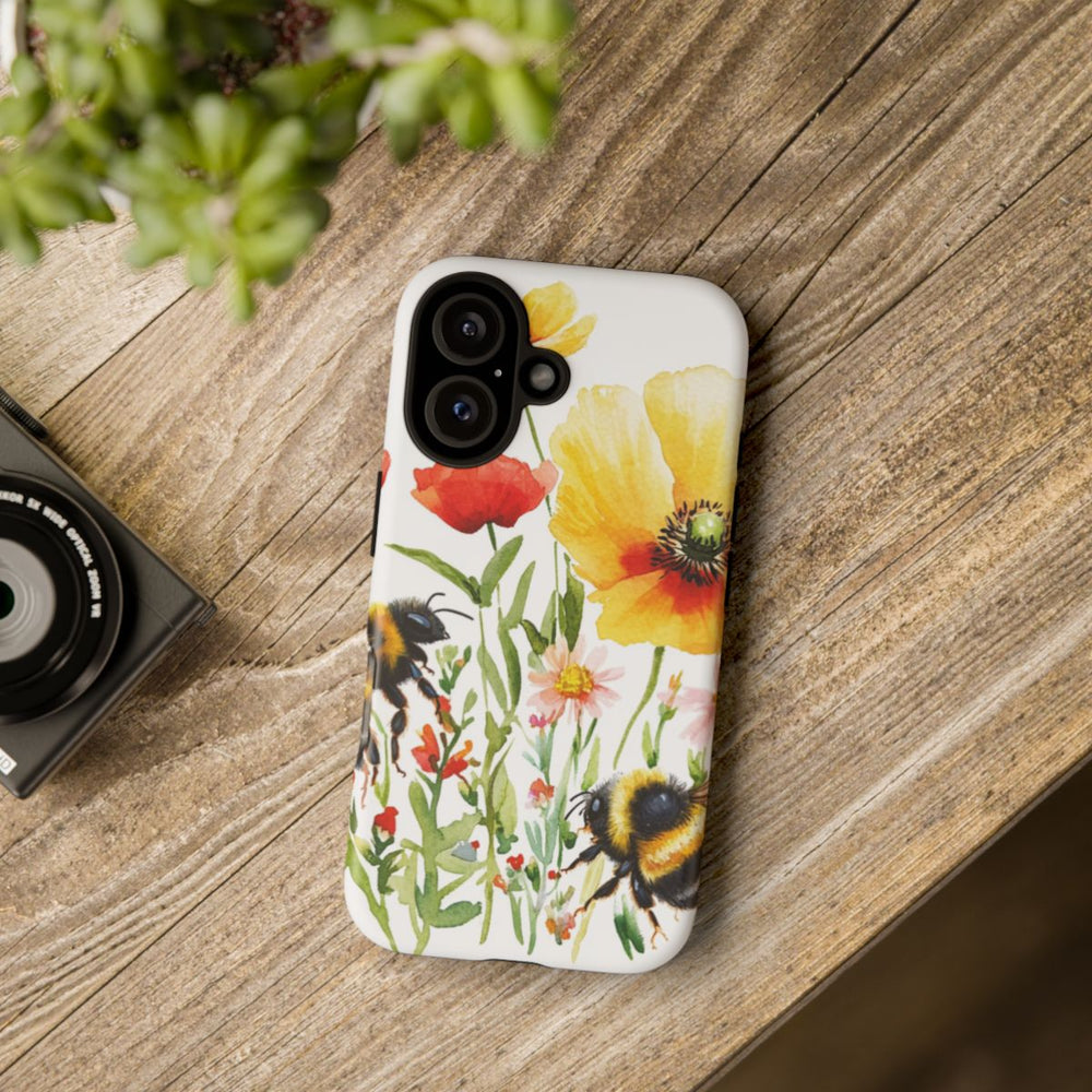 Dit hoesje is voorzien van een aquarelillustratie met twee hommels, één groot en één klein, omringd door verschillende wilde bloemen. De bloemen bestaan uit grote gele exemplaren, rode klaprozen en kleinere roze en oranje bloemen met groene stelen en bladeren. De afbeelding heeft zachte texturen en natuurlijke kleurverlopen, en staat afgebeeld op een helderwitte achtergrond. Het matte, stevige hoesje is gemaakt van polycarbonaat en TPU en is geschikt voor draadloos opladen.