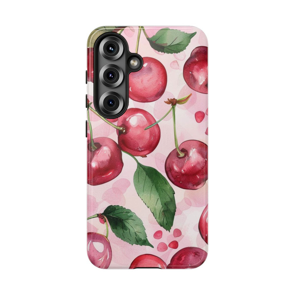 Dit hoesje heeft een herhalend patroon van aquarel kersen met groene blaadjes op een zachtroze achtergrond. De kersen zijn afgebeeld in verschillende roodtinten met glanzende accenten, wat zorgt voor een frisse uitstraling. De groene bladeren vormen een mooi natuurlijk contrast met het rood van de kersen. Op de achtergrond zijn subtiele roze vormen en stipjes te zien, wat het geheel een verfijnde en artistieke uitstraling geeft. Het glanzende, stevige hoesje bestaat uit een duurzame dubbele laag van polycarbonaat en TPU en is geschikt voor draadloos opladen.