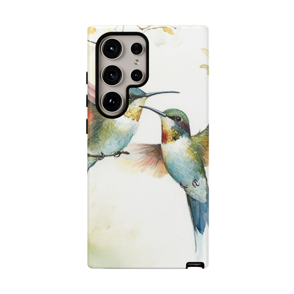 Dit telefoonhoesje is voorzien van een prachtig aquarelontwerp met twee kolibries in levendige tinten groen, blauw en oranje. Eén vogel zit op een fijne bruine tak met gele en groene bladeren, terwijl de andere met gespreide vleugels in de lucht zweeft. De lichte achtergrond versterkt het delicate en luchtige karakter van het ontwerp. Het hoesje bestaat uit twee lagen van polycarbonaat en TPU, waardoor het extra stevig is en goed bestand tegen gebruik buitenshuis. Geschikt voor draadloos opladen.