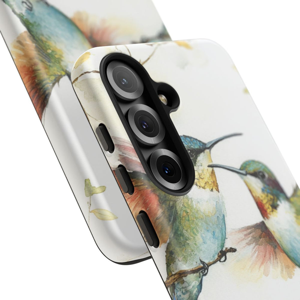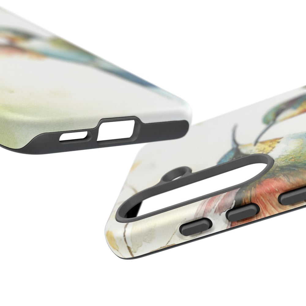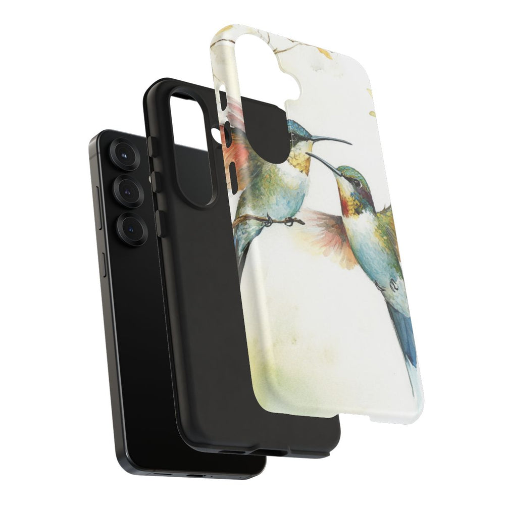 Dit ontwerp toont twee kolibries in aquarel die elkaar in de lucht ontmoeten, vlak bij fijne takjes met kleine blaadjes. De vogels hebben zachte tinten groen, blauw en oranje, met prachtig gedetailleerde, gespreide vleugels. De lichte achtergrond bevat subtiele accenten van groen en beige, wat zorgt voor een rustige en natuurlijke uitstraling. Het hoesje bestaat uit twee lagen met een matte afwerking: een stevige polycarbonaat buitenkant en een TPU-binnenzijde. Geschikt voor draadloos opladen en bestand tegen verschillende weersomstandigheden.