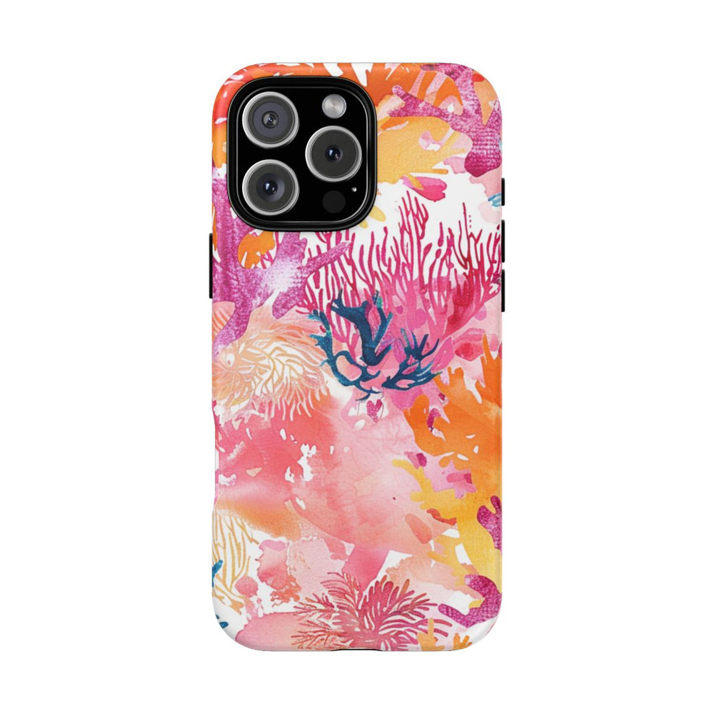 Dit hoesje is voorzien van een levendig aquarelpatroon met verschillende koraalvormen in tinten felroze, oranje, pastelroze, pasteloranje en accenten van blauw. Het naadloze en artistieke ontwerp zorgt voor een speels onderwatergevoel. Het matte hoesje heeft een dubbele laag van polycarbonaat en TPU, wat zorgt voor extra stevigheid en bescherming. Geschikt voor draadloos opladen en bestand tegen invloeden van buitenaf.