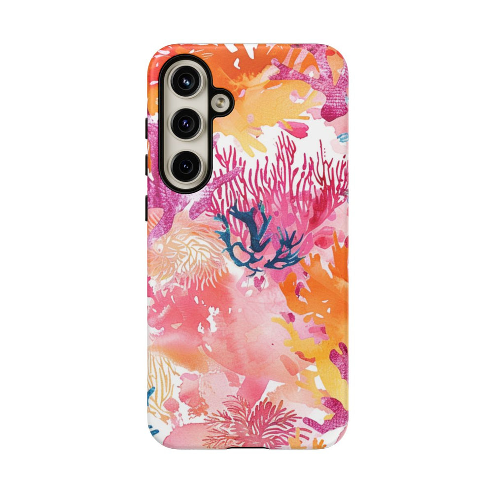 Dit hoesje is voorzien van een levendig aquarelpatroon met verschillende koraalvormen in tinten felroze, oranje, pastelroze, pasteloranje en accenten van blauw. Het naadloze en artistieke ontwerp zorgt voor een speels onderwatergevoel. Het matte hoesje heeft een dubbele laag van polycarbonaat en TPU, wat zorgt voor extra stevigheid en bescherming. Geschikt voor draadloos opladen en bestand tegen invloeden van buitenaf.