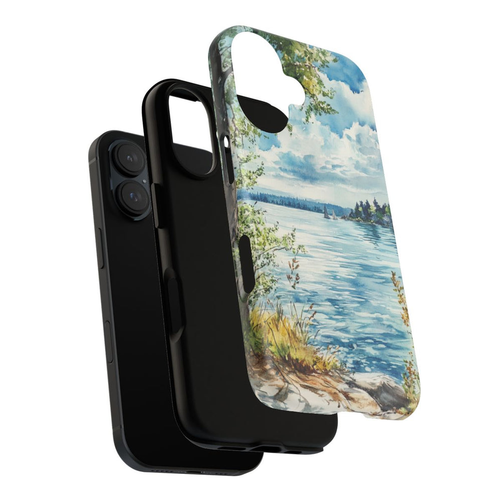 Dit hoesje is bedrukt met een aquarel van een rustig meerlandschap. Op de voorgrond staan bomen met groene bladeren en groeien bruingeel gekleurde grasplukken langs de rotsachtige oever. Het kalme water weerspiegelt de blauwe lucht met witte wolken. Verderop varen twee zeilboten bij een eiland dat begroeid is met bomen. Het ontwerp is aangebracht op een stevige, matte telefoonhoes met een dubbele laag: een polycarbonaat buitenkant en een TPU binnenzijde. Deze combinatie biedt extra bescherming, is geschikt voor gebruik buitenshuis en ondersteunt draadloos opladen.