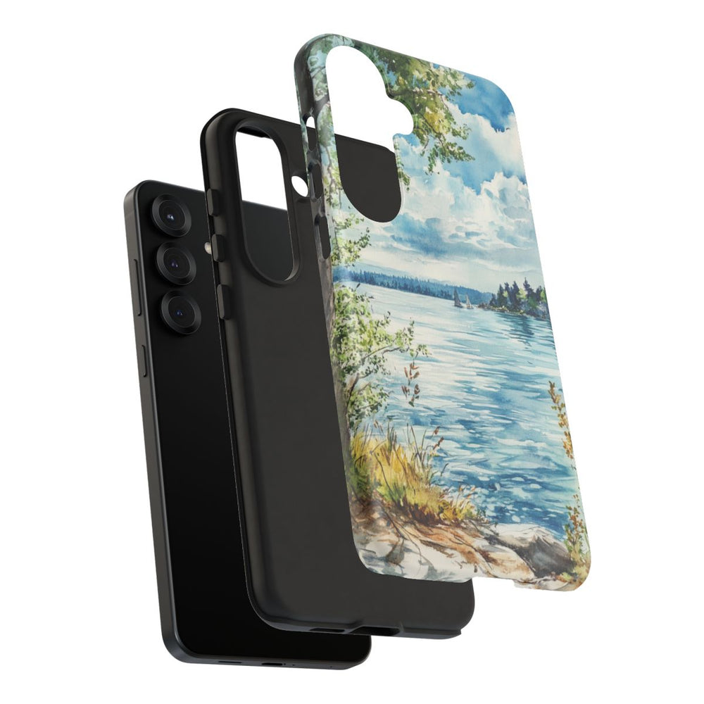 Dit telefoonhoesje is voorzien van een aquareltekening van een rustgevend meerlandschap. Op de voorgrond staan bomen met groene bladeren en groeit wat gelig gras langs de rotsachtige oever. Het kalme blauwe water weerspiegelt de lucht met witte wolken. In de verte dobberen twee kleine zeilboten bij een eiland dat begroeid is met bomen. De afbeelding straalt een serene, natuurlijke sfeer uit door de zachte kleuren en verfijnde penseelstreken. Het hoesje bestaat uit twee lagen: een stevige polycarbonaat buitenkant en een TPU binnenzijde. Ondersteunt draadloos opladen.