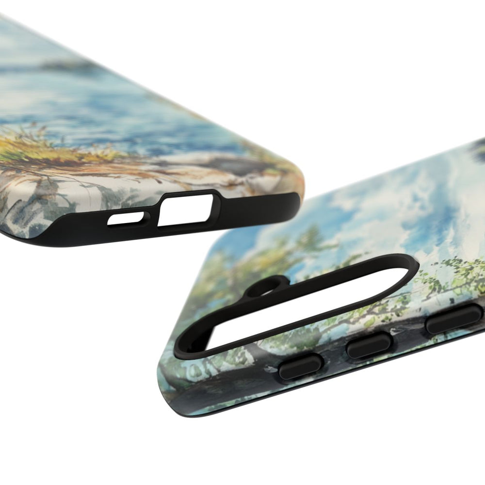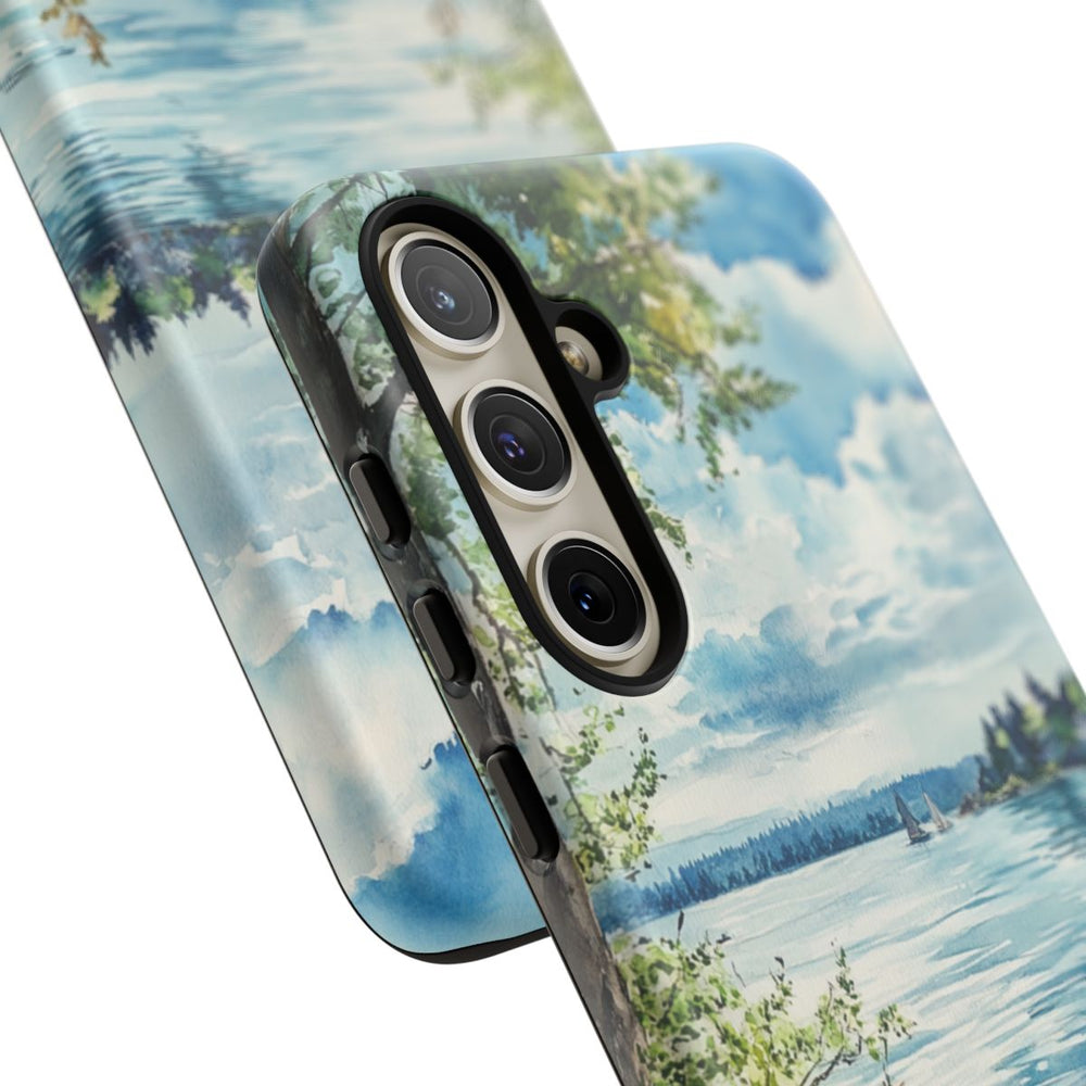 Dit telefoonhoesje toont een sfeervol aquarel schilderij van een rustig meer. Op de voorgrond staat een boom met groene bladeren en groeien er grassen langs een rotsachtige oever. Het water van het meer weerspiegelt de blauwe lucht met zachte witte wolken. In de verte ligt een klein eiland met bomen en varen er twee zeilboten op het water. Het hoesje heeft een dubbele laag van polycarbonaat en TPU, biedt extra bescherming en ondersteunt draadloos opladen.