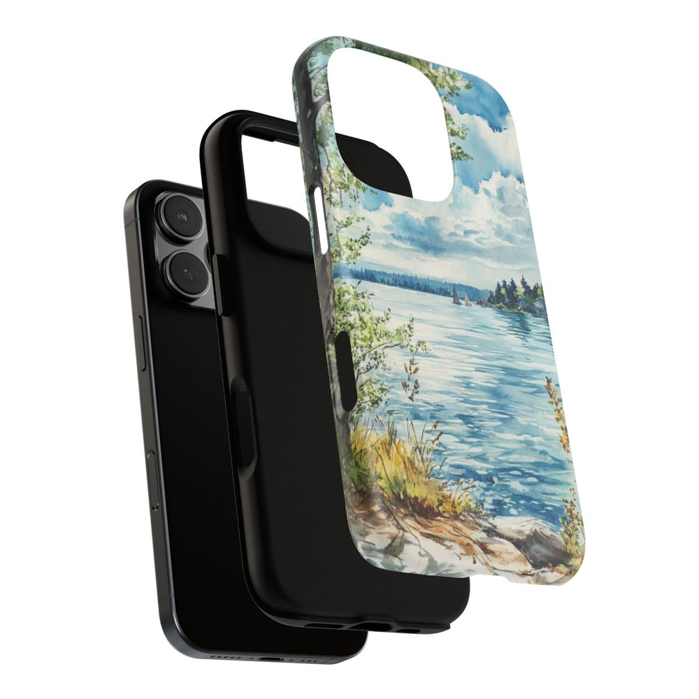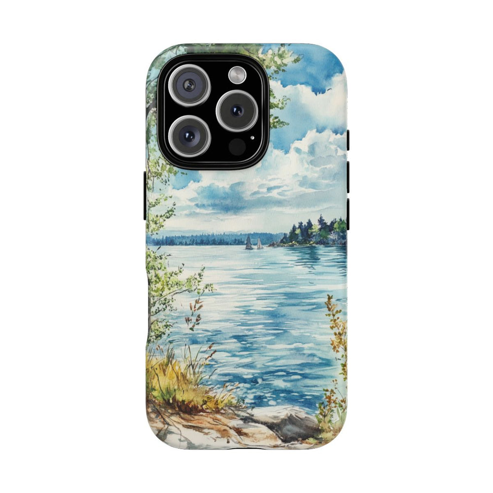 Dit telefoonhoesje is voorzien van een aquarelillustratie van een rustig meerlandschap. Op de voorgrond staat een grote boom met groene bladeren en groeien er grasplanten langs de oever. Het meer weerspiegelt de blauwe lucht met zachte, witte wolken. In de verte varen twee kleine zeilboten op het water en ligt een eiland bedekt met bomen. Het hoesje bestaat uit twee lagen, heeft een matte afwerking en is gemaakt van polycarbonaat en TPU. Draadloos opladen wordt ondersteund, maar het hoesje is niet geschikt voor MagSafe.