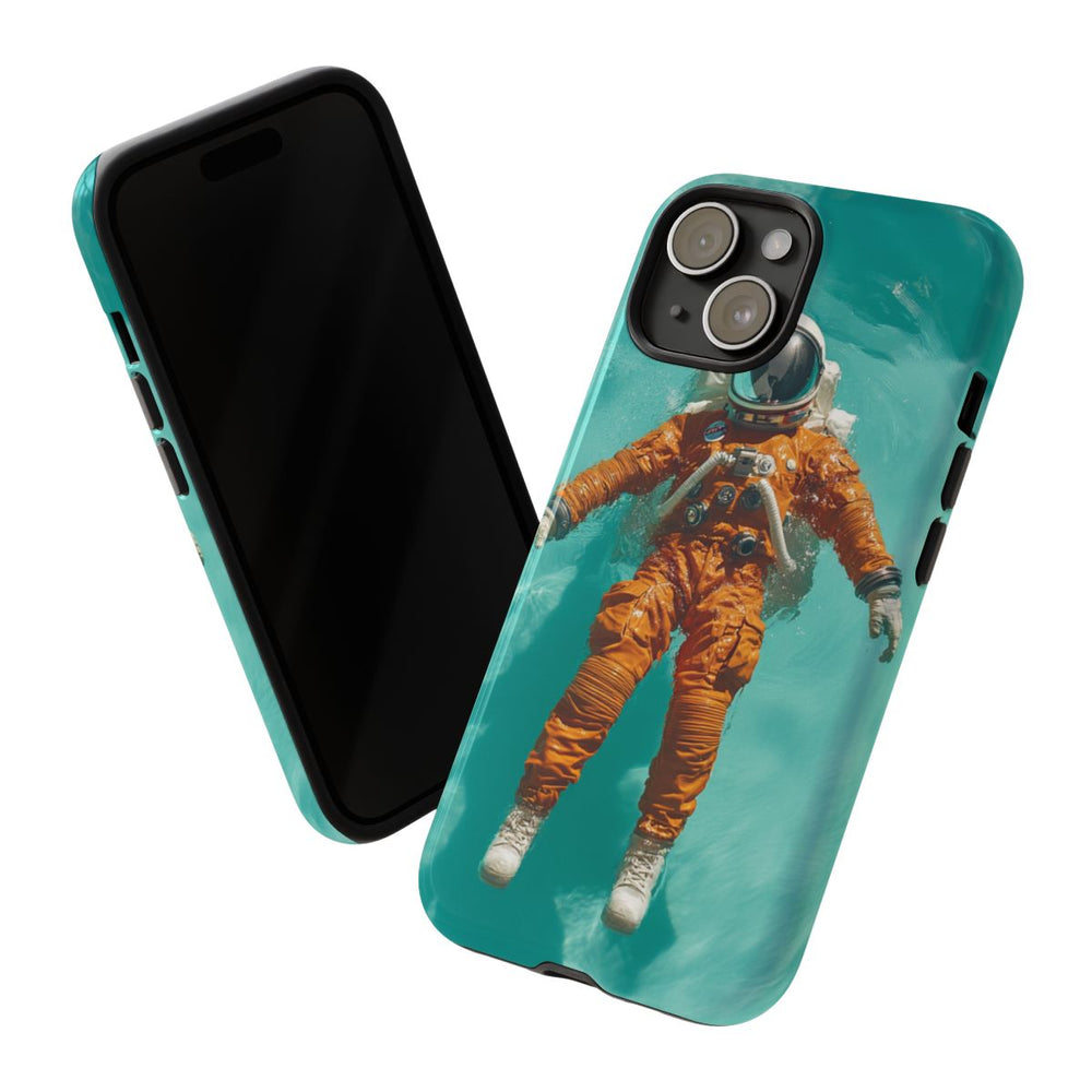 Dit hoesje toont een persoon in een gedetailleerd oranje astronautenpak die op zijn rug drijft in helder turquoise water. De helm is reflecterend en op de borst van het pak zijn verschillende slangen en bedieningspanelen zichtbaar. Het wateroppervlak heeft zachte rimpelingen en lichte weerkaatsingen, wat zorgt voor een kalme en surrealistische sfeer. De afbeelding is gedrukt op een glanzend, stevig telefoonhoesje met een buitenkant van polycarbonaat en een binnenzijde van TPU. Het hoesje biedt dubbele bescherming en is geschikt voor draadloos opladen.