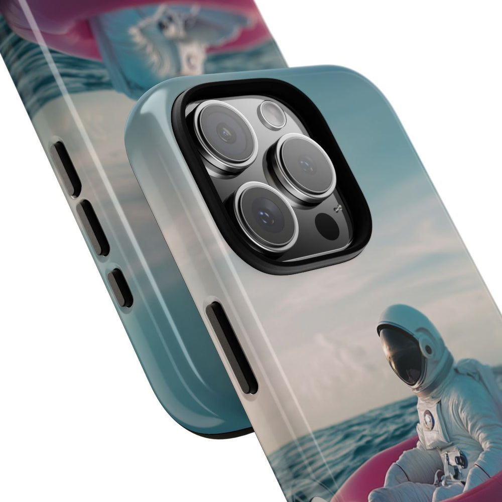 Dit telefoonhoesje toont een afbeelding van een astronaut in een wit ruimtepak, zittend in een felroze opblaasbare zwemband. De zwemband drijft op een rustige zee met zachte golven, onder een lichte, deels bewolkte lucht. De astronaut zit alleen en is centraal in beeld geplaatst, met de horizon op de achtergrond. Het hoesje is glanzend en stevig, bestaat uit een dubbele laag van polycarbonaat en TPU, en is ontworpen voor extra duurzaamheid en bescherming buitenshuis. Geschikt voor draadloos opladen.