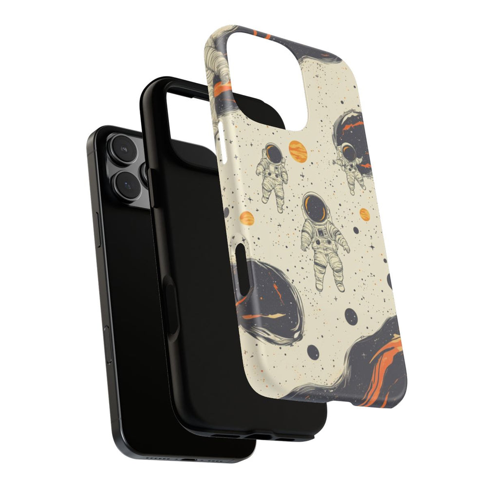 Dit hoesje heeft een speels patroon van astronauten die zweven tussen planeten en wervelende nevels in de ruimte. De achtergrond is lichtbeige met verspreide sterren en stippen. De astronauten zijn gedetailleerd getekend in ruimtepakken met donkere vizieren. De nevels zijn donker met heldere oranje accenten, wat zorgt voor een levendig contrast. Het hoesje bestaat uit twee lagen voor extra bescherming en is geschikt voor draadloos opladen.