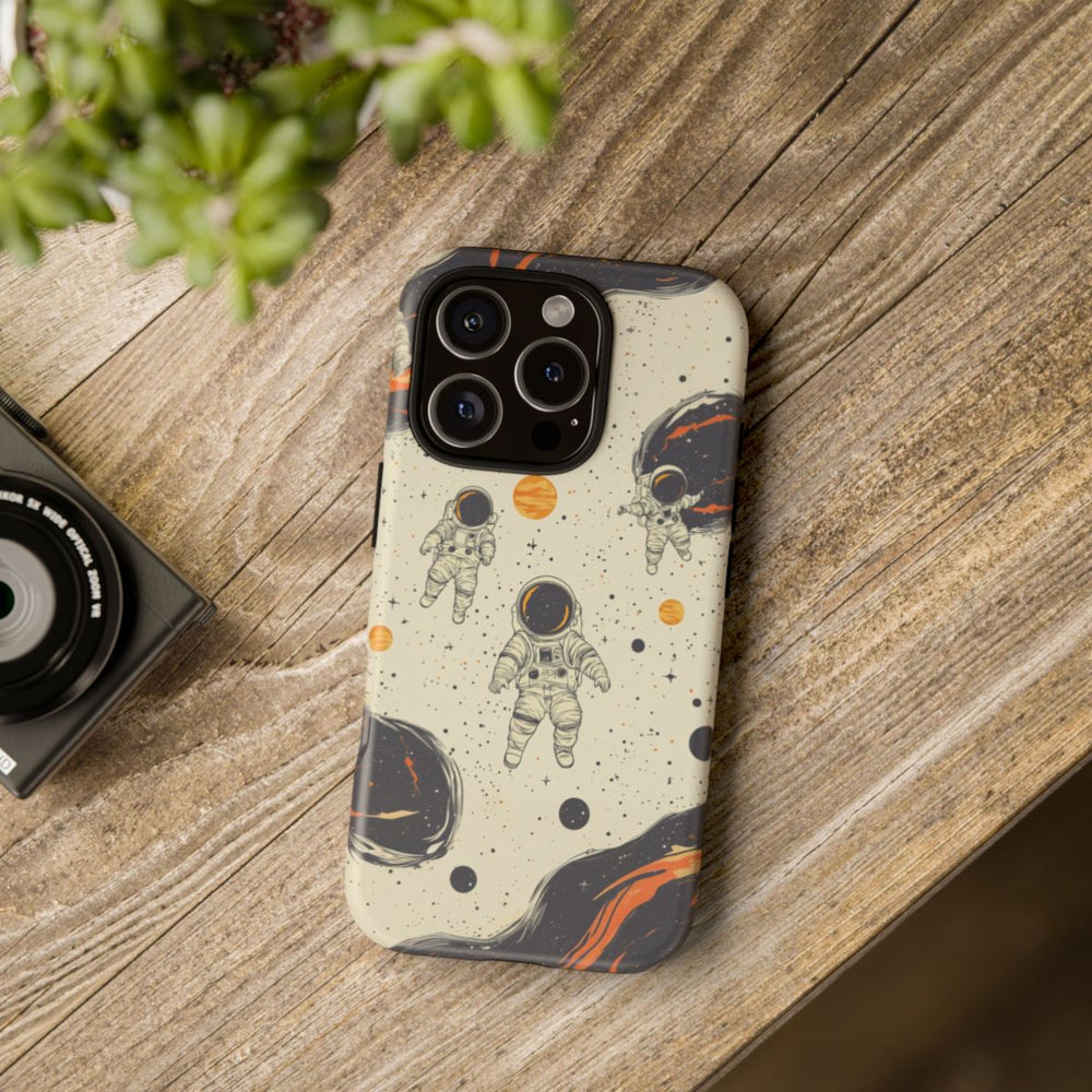 Dit telefoonhoesje heeft een speels patroon van astronauten die zweven tussen donkere kosmische wolken met heldere oranje accenten. De lichte achtergrond is versierd met kleine sterren en planeten in zwarte en oranje tinten. Dankzij de dubbele laag, bestaande uit een stevige polycarbonaat buitenkant en een TPU binnenkant, biedt het hoesje extra stevigheid en bescherming. Draadloos opladen wordt ondersteund, maar het hoesje is niet geschikt voor MagSafe.