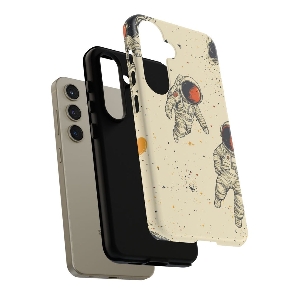Dit telefoonhoesje heeft een speels patroon van drie astronauten die zweven in de ruimte. De achtergrond is lichtbeige met zwarte sterrenvelden en verspreide kleine sterren en stippen in oranje, zwart en geel. De astronauten dragen gedetailleerde pakken met oranje vizieren. Het hoesje bestaat uit twee stevige lagen van polycarbonaat en TPU, biedt bescherming tegen stoten en weersinvloeden, en ondersteunt draadloos opladen.