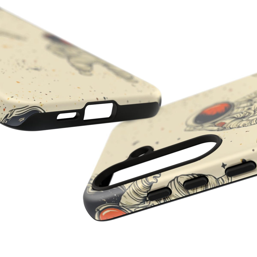 Dit hoesje heeft een herhalend patroon van drie astronauten die zweven in de ruimte. De astronauten dragen gedetailleerde ruimtepakken met oranje vizieren. De achtergrond is crèmekleurig met zwarte, onregelmatige vormen die doen denken aan kosmische wolken en verspreide kleine sterren en stippen in oranje, zwart en geel. Het hoesje bestaat uit twee lagen van polycarbonaat en TPU met een matte afwerking, en is geschikt voor draadloos opladen.