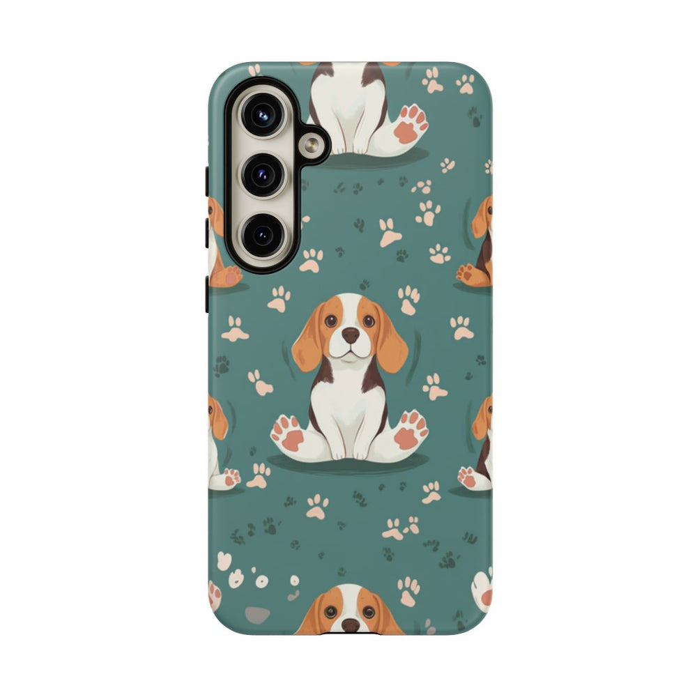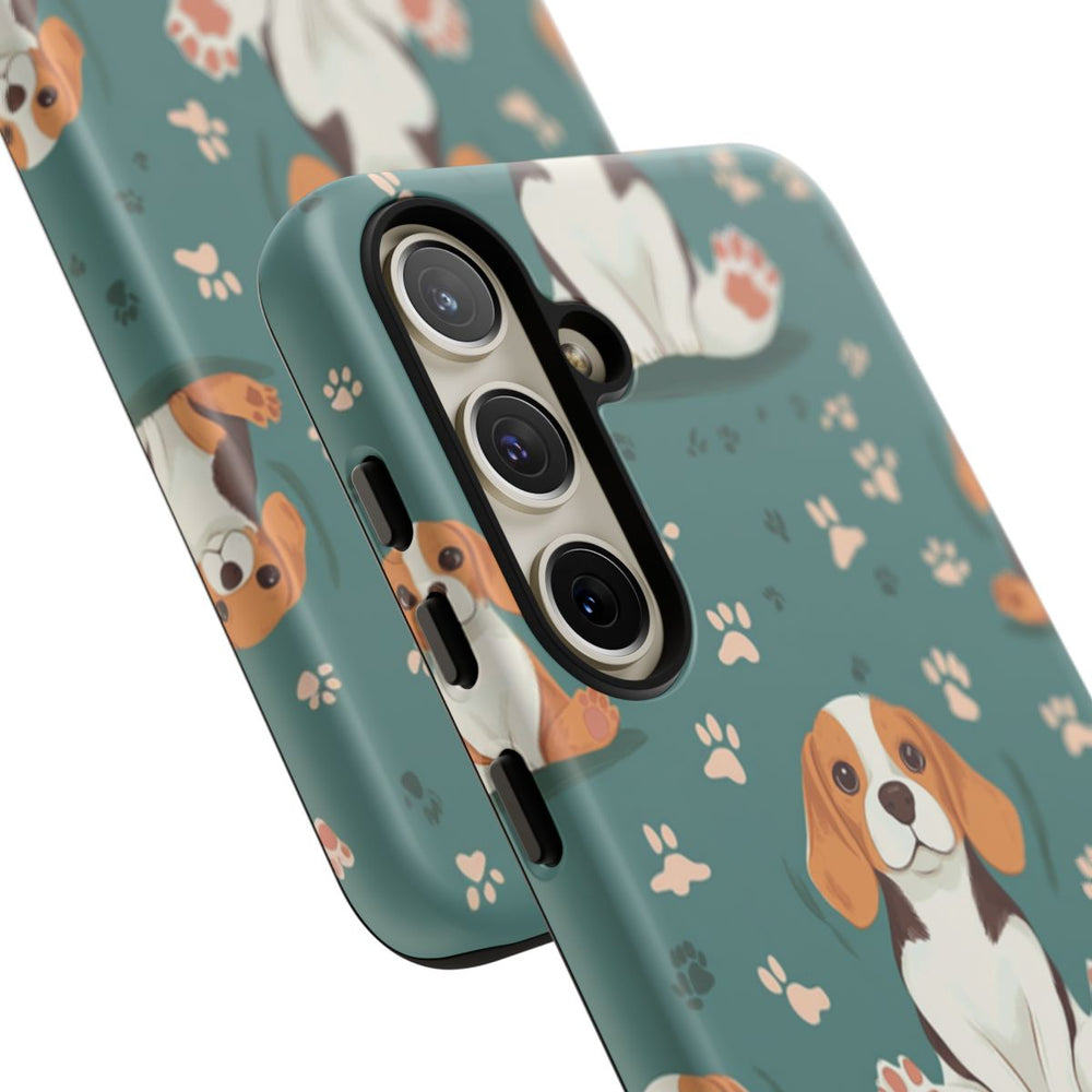 Dit telefoonhoesje heeft een vrolijk patroon met meerdere beagles die zittend zijn afgebeeld op een effen petrolblauwe achtergrond. De honden zijn getekend in een schattige, cartoonachtige stijl met bruin, wit en zwart gekleurde vacht. Rondom de beagles staan pootafdrukken in lichtroze en donker petrolblauw, wat zorgt voor een speels geheel. Het matte hoesje bestaat uit een stevige polycarbonaat buitenkant en een TPU binnenzijde, wat zorgt voor dubbele bescherming. Geschikt voor draadloos opladen.