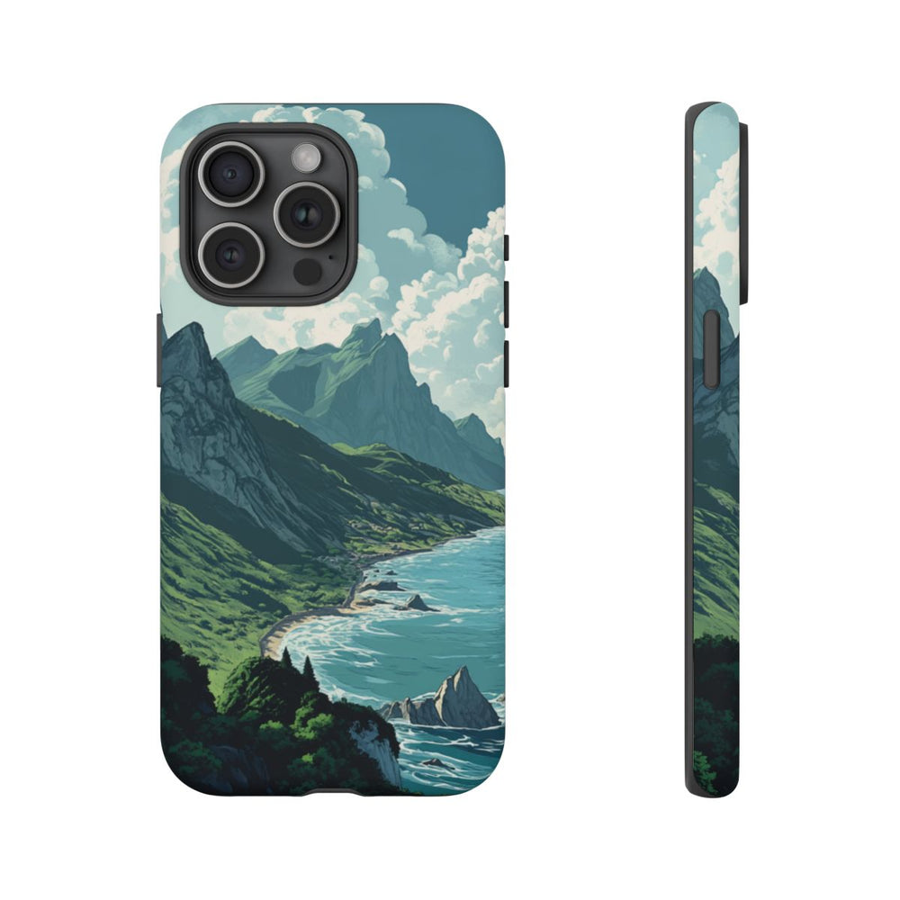 Dit telefoonhoesje is voorzien van een prachtig landschap met imposante bergen en een rustige zee. De afbeelding kenmerkt zich door dramatische bergtoppen, weelderig groen en wolken die diepte geven aan de lucht. De rijke, levendige kleuren zorgen voor een opvallend geheel. Het hoesje bestaat uit twee lagen van polycarbonaat en TPU voor extra stevigheid en bescherming. Dankzij de ondersteuning voor draadloos opladen is dit hoesje ideaal voor dagelijks gebruik.
