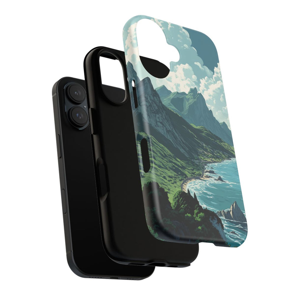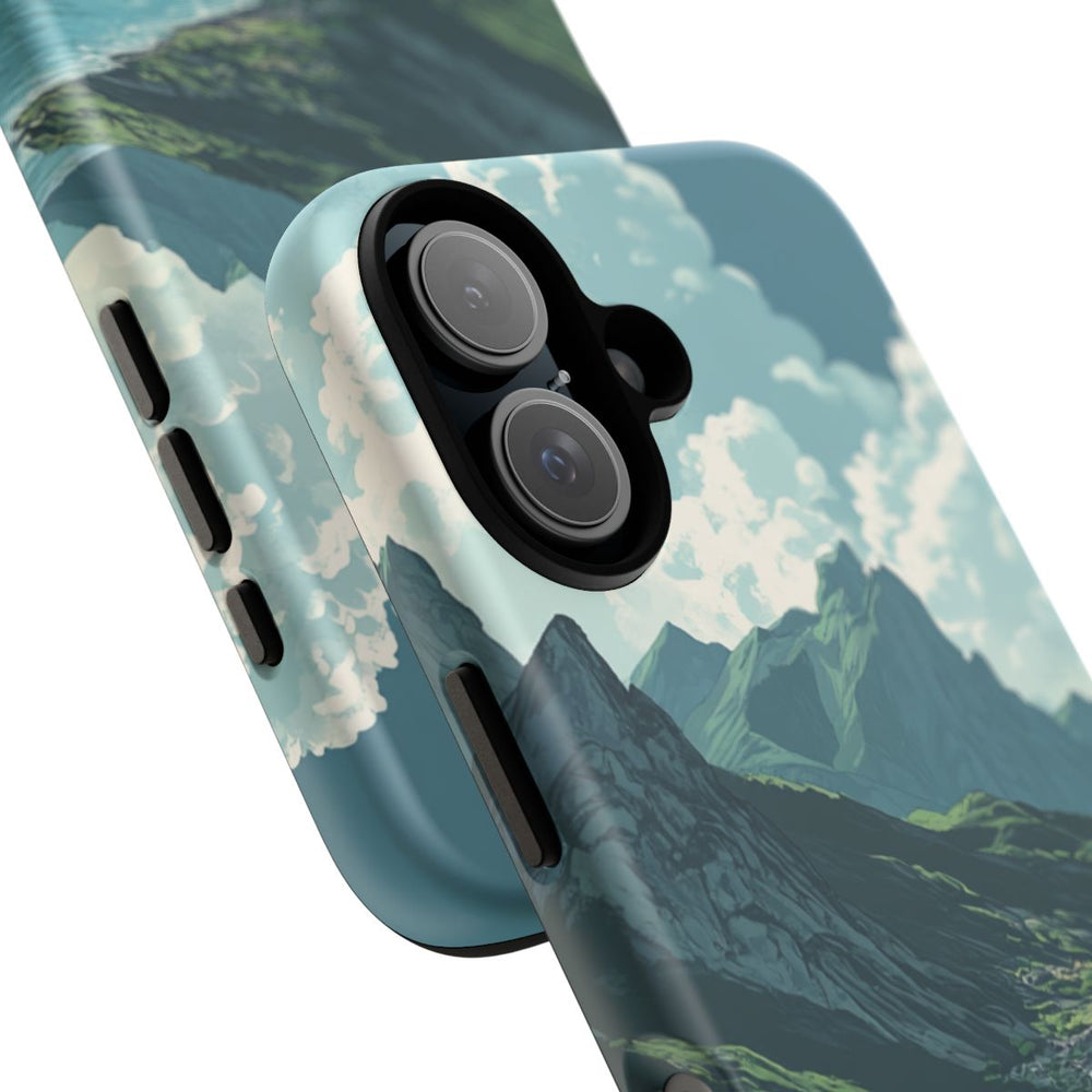 Dit hoesje is bedrukt met een prachtig uitzicht op bergen en een kalme zee. De bergen hebben scherpe toppen en zijn bedekt met weelderig groen, terwijl de kustlijn bestaat uit rotsachtige formaties. In de lucht zweven zachte, witte wolken, wat zorgt voor een rustgevende sfeer. Het duurzame hoesje is gemaakt van 100% polycarbonaat en 100% TPU en biedt uitstekende bescherming. Bovendien ondersteunt het hoesje draadloos opladen, wat het gebruiksgemak vergroot.