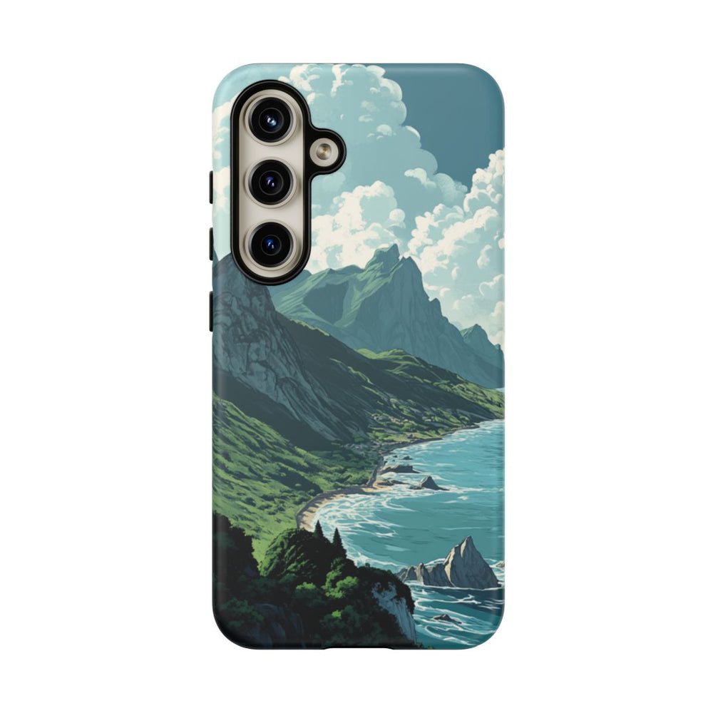 Dit hoesje heeft een prachtig ontwerp met een indrukwekkend berg- en zeezicht. Weelderig groen en rotsachtige kliffen lopen af naar het water, terwijl de lucht is versierd met zachte wolken voor een rustgevende uitstraling. De levendige kleuren brengen de schoonheid van de natuur extra tot leven. Dankzij de dubbele laag biedt het hoesje extra bescherming en is het geschikt voor draadloos opladen. Ideaal voor liefhebbers van mooie vergezichten.