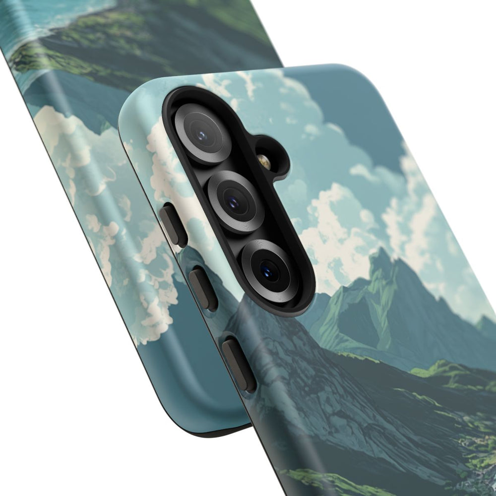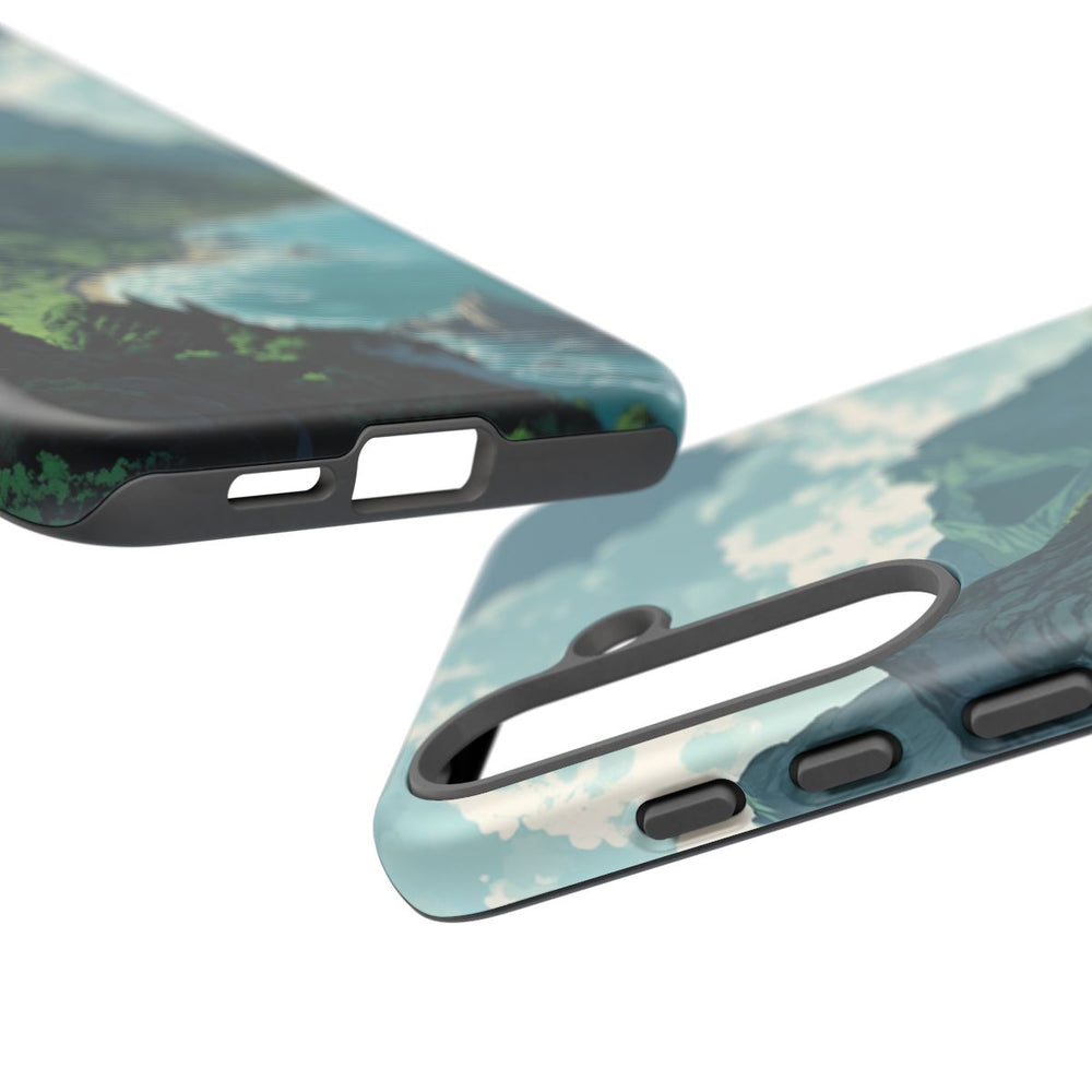 Dit hoesje toont een indrukwekkend uitzicht op bergen en zee, met steile kliffen en weelderig groen. De lucht is gevuld met grote, zachte wolken en zorgt voor een rustige sfeer. Het ontwerp vangt de schoonheid van de natuur met een combinatie van blauwe oceaan en groene landschappen. Het matte, stevige hoesje sluit perfect aan en beschermt je toestel, terwijl het deze prachtige afbeelding laat zien.