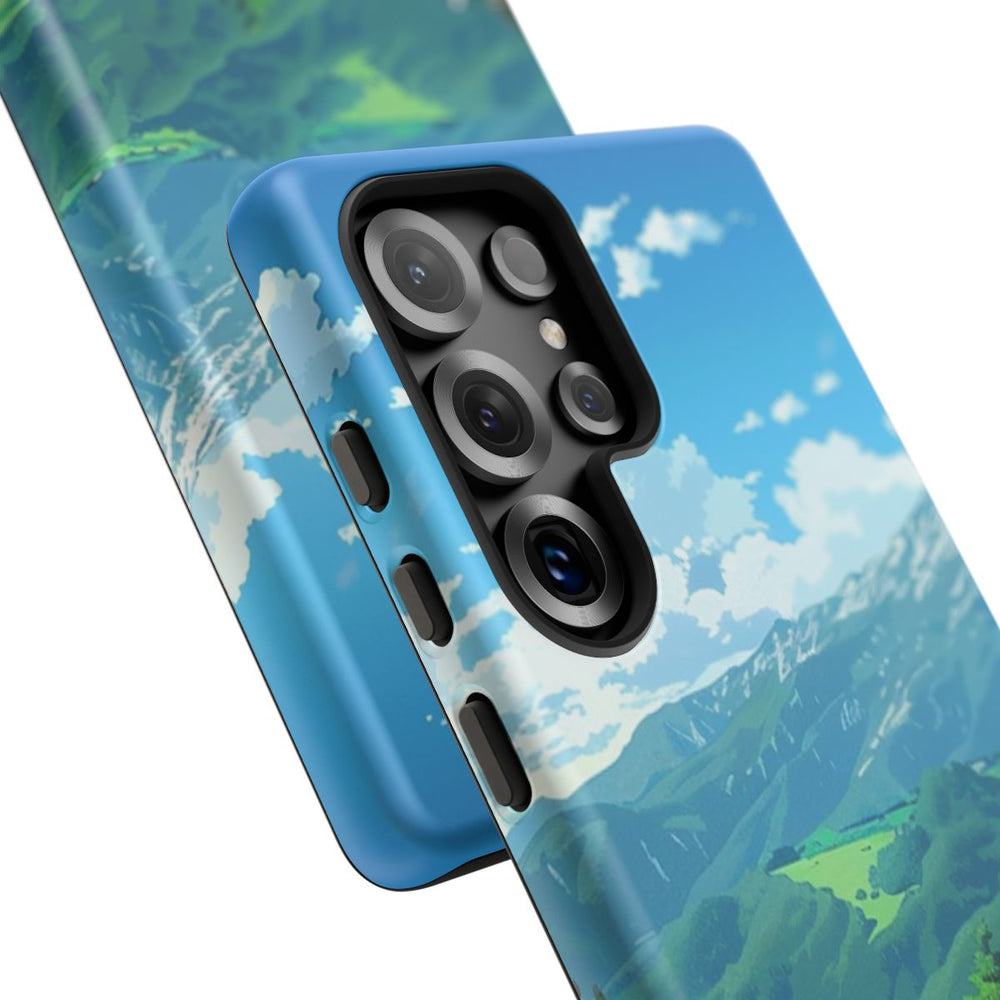 Dit hoesje toont een gedetailleerde, getekende afbeelding van een berglandschap onder een heldere blauwe lucht met witte wolken. Op een onverhard pad staat een lichtgekleurde bus geparkeerd, omringd door groen gras, rotsen en wilde bloemen. Op de achtergrond zijn uitgestrekte groene heuvels en een besneeuwde bergketen te zien. Het ontwerp is levendig en kleurrijk en brengt een rustgevend moment in de natuur tot leven. Het hoesje bestaat uit twee lagen met een matte afwerking: een stevige polycarbonaat buitenkant en een TPU binnenzijde. Het ondersteunt draadloos opladen en is bestand tegen verschillende weersomstandigheden.