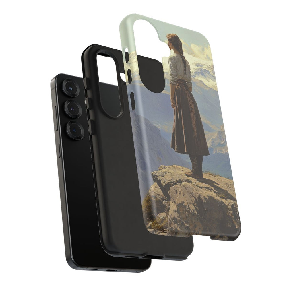 Dit hoesje toont een jonge vrouw die op een rots staat en uitkijkt over een adembenemend berglandschap. Ze draagt traditionele kleding met een lange rok en een blouse. Op de achtergrond zijn indrukwekkende, met sneeuw bedekte bergen en een heldere blauwe lucht te zien, wat zorgt voor een rustige en schilderachtige sfeer. Ideaal voor liefhebbers van natuur en klassieke kunst. Het matte, stevige hoesje biedt uitstekende bescherming en is geschikt voor draadloos opladen.