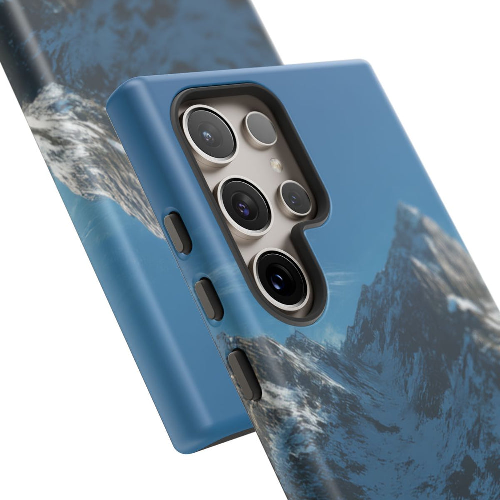Dit telefoonhoesje heeft een gedetailleerde afbeelding van een bergketen met besneeuwde toppen onder een heldere blauwe lucht. De bergen zijn robuust, met witte sneeuwvlakken en ruwe rotsstructuren. Aan de voet van de bergen bevindt zich een bos met donkergroene bomen en een grasrijke voorgrond. Het hoesje bestaat uit twee stevige lagen van polycarbonaat en TPU en biedt extra stevigheid en bescherming. Draadloos opladen wordt ondersteund. Niet geschikt voor MagSafe.