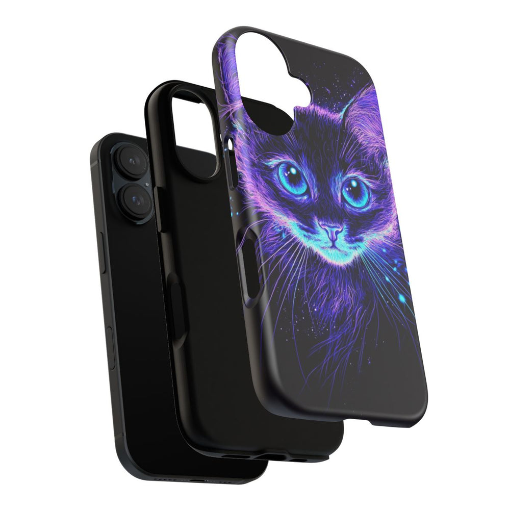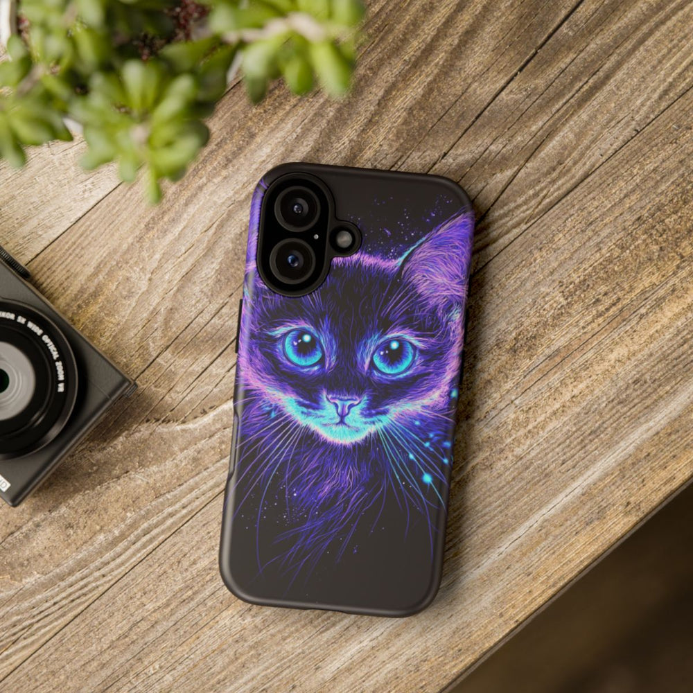 Dit ontwerp toont een schattig kattengezicht met grote, lichtgevende blauwgroene ogen en stralende snorharen. De vacht is zacht en glanst in paarse en blauwe tinten, wat een sprookjesachtige uitstraling geeft. Lichtdeeltjes dansen rond de oren van het katje en zorgen voor een magisch effect. De donkere achtergrond laat de levendige kleuren van het gezicht extra opvallen. Dit matte, stevige hoesje heeft een dubbele laag voor extra stevigheid en bescherming, en ondersteunt draadloos opladen.