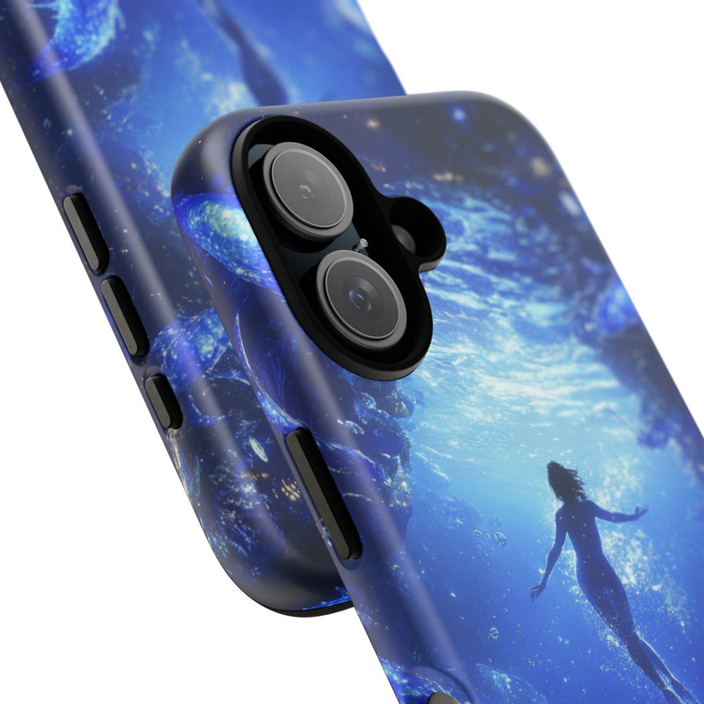 Dit hoesje toont een sfeervolle onderwaterscène met een silhouet van een zwemmer, omringd door grote, lichtgevende vissen. Het diepe blauwe water wordt verlicht door helder licht van boven en fonkelende details verspreid over het geheel. De afbeelding straalt een serene en mysterieuze sfeer uit, met stralende zeedieren en luchtbellen. Het telefoonhoesje is voorzien van een stevige dubbele laag en een zachte voering, en ondersteunt draadloos opladen.