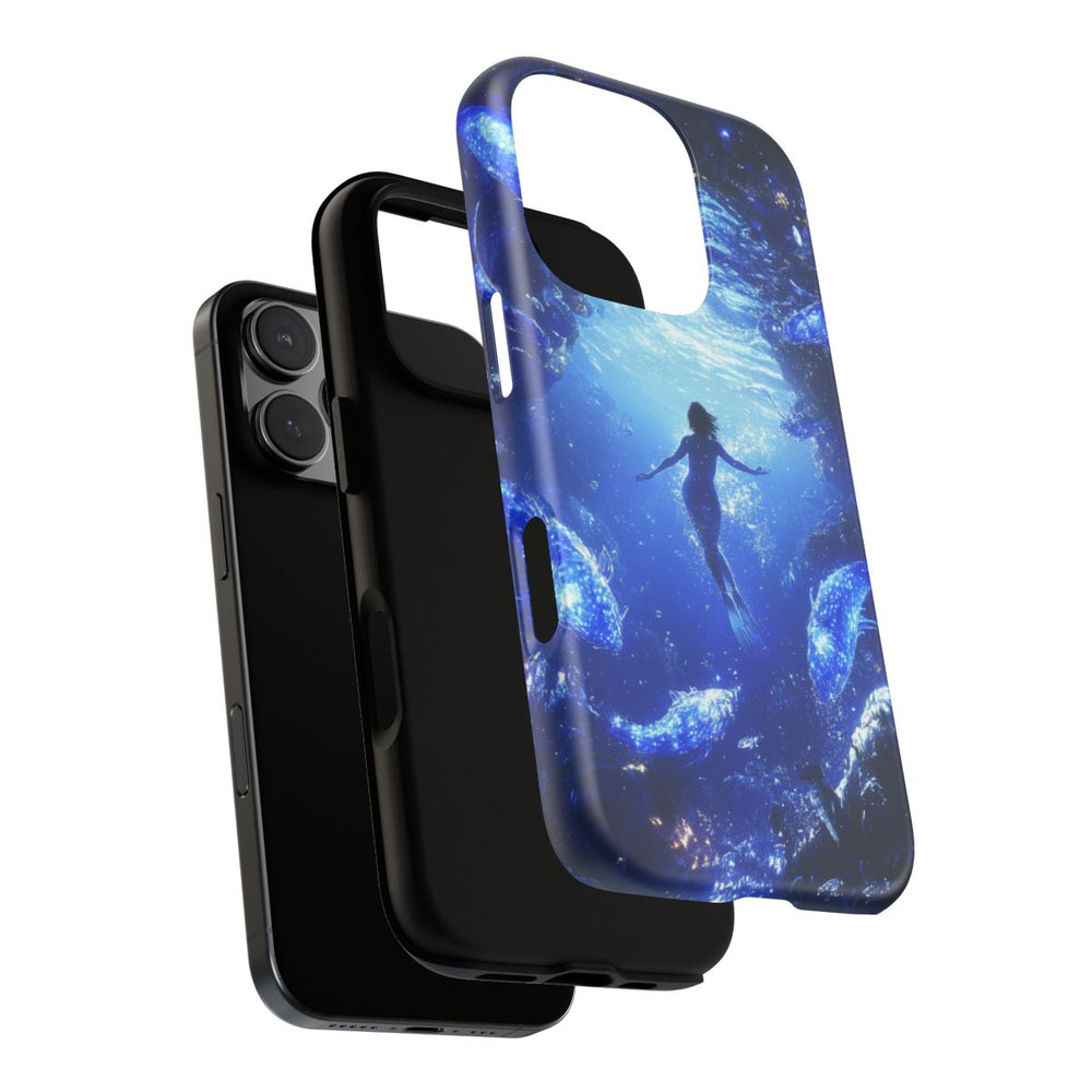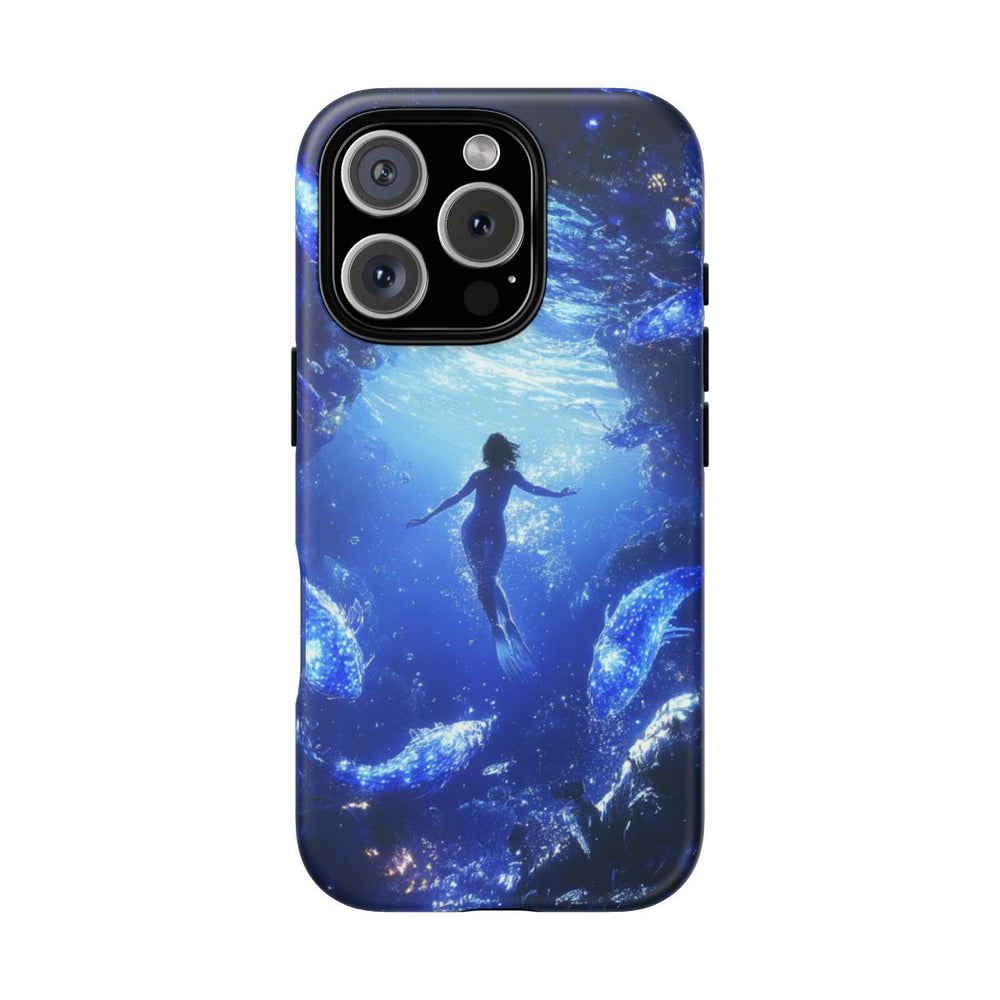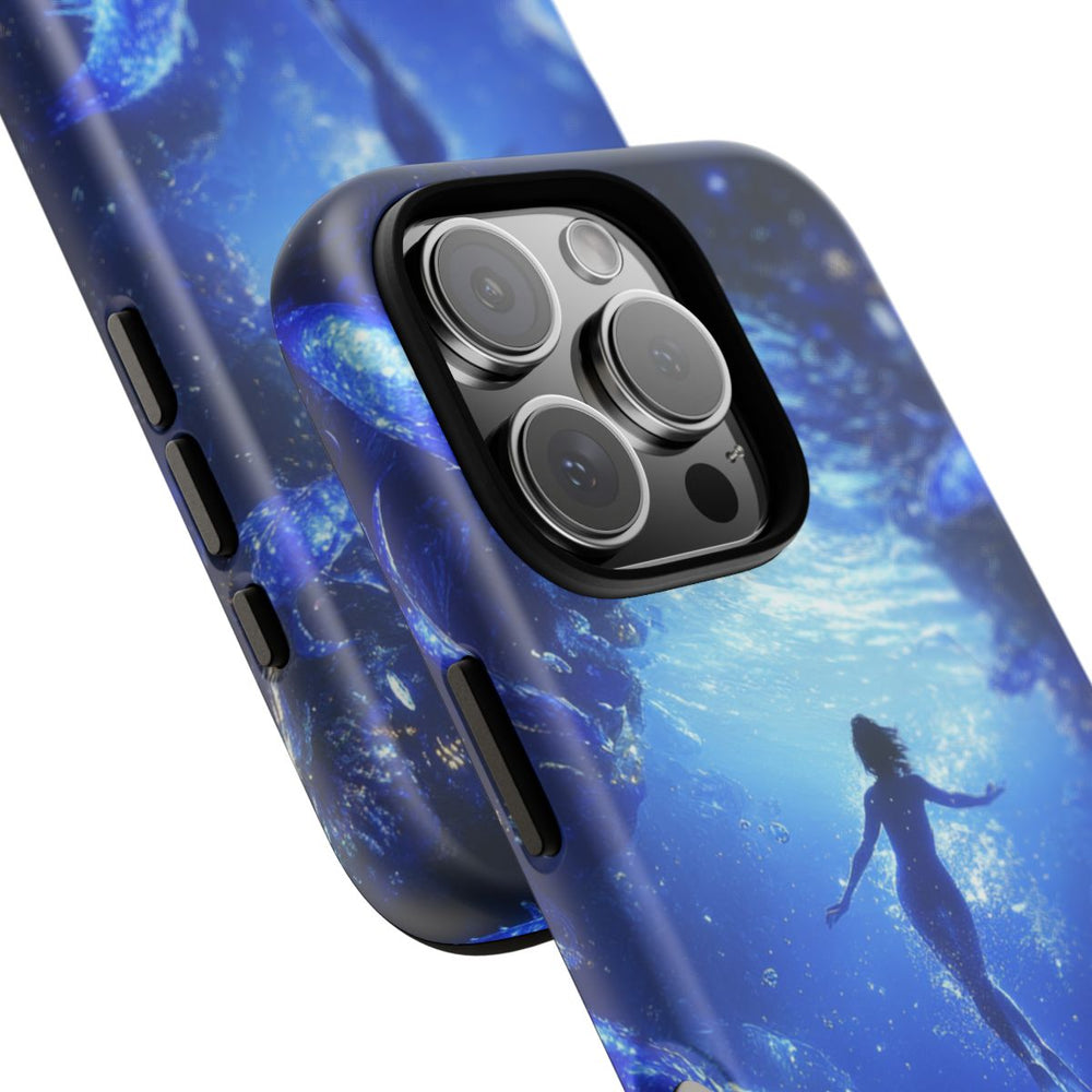 Dit ontwerp toont de schaduw van een zwemmer die onder water wordt omringd door grote, lichtgevende bioluminescerende vissen. De scène heeft een diepe blauwe kleur, waarbij fel licht van bovenaf het water en de dieren verlicht. De afbeelding straalt een mysterieuze en rustige onderwatersfeer uit, met gedetailleerde lichtreflecties en luchtbellen. Het hoesje bestaat uit twee lagen met een matte afwerking en is gemaakt van polycarbonaat en TPU. Geschikt voor draadloos opladen.