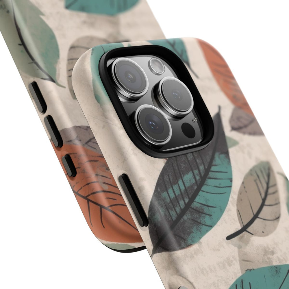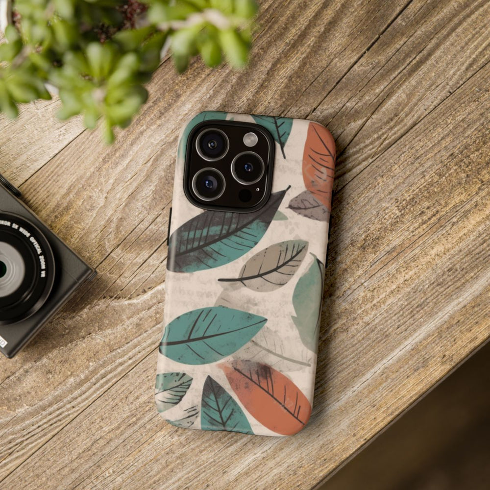 Dit ontwerp heeft een herhalend patroon van bladeren in gedempte tinten blauwgroen, oranje, beige en grijs. De bladeren zijn voorzien van zichtbare nerven en hebben een licht ruwe, verweerde uitstraling met een gelaagd effect. De achtergrond is zacht gebroken wit met een subtiele structuur, wat het natuurlijke en artistieke karakter versterkt. Het patroon is bedrukt op een mat hoesje met een stevige dubbele laag voor extra bescherming en duurzaamheid. Ondersteunt draadloos opladen.