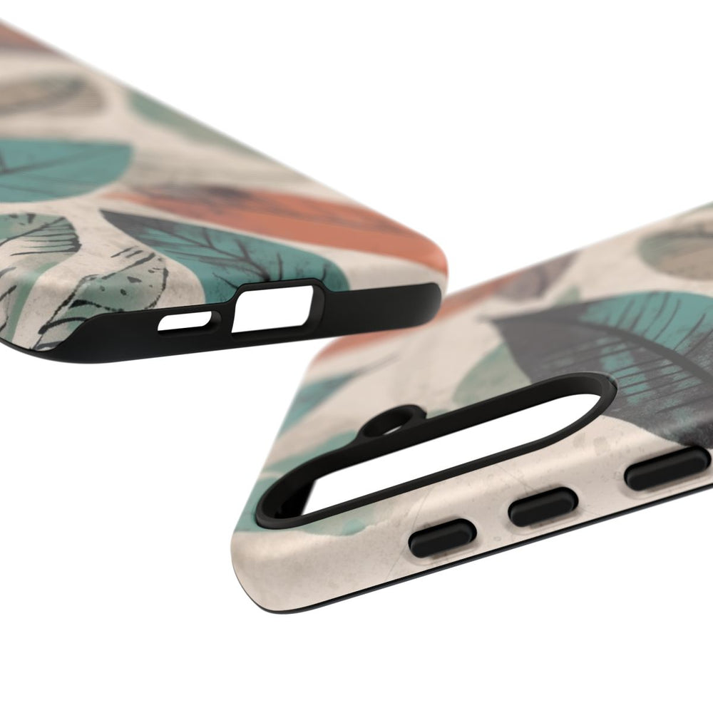 Dit ontwerp heeft een herhalend patroon van bladeren in gedempte tinten blauwgroen, oranje, beige en grijs. De bladeren zijn voorzien van zichtbare nerven en hebben een licht ruwe, verweerde uitstraling met een gelaagd effect. De achtergrond is zacht gebroken wit met een subtiele structuur, wat het natuurlijke en artistieke karakter versterkt. Het patroon is bedrukt op een mat hoesje met een stevige dubbele laag voor extra bescherming en duurzaamheid. Ondersteunt draadloos opladen.