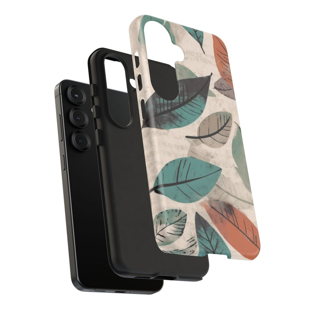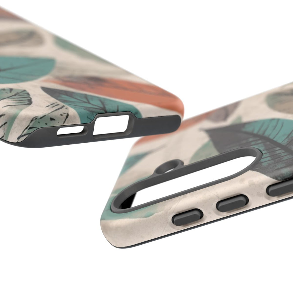 Dit ontwerp heeft een herhalend patroon van bladeren in gedempte tinten blauwgroen, oranje, beige en grijs. De bladeren zijn voorzien van zichtbare nerven en hebben een licht ruwe, verweerde uitstraling met een gelaagd effect. De achtergrond is zacht gebroken wit met een subtiele structuur, wat het natuurlijke en artistieke karakter versterkt. Het patroon is bedrukt op een mat hoesje met een stevige dubbele laag voor extra bescherming en duurzaamheid. Ondersteunt draadloos opladen.